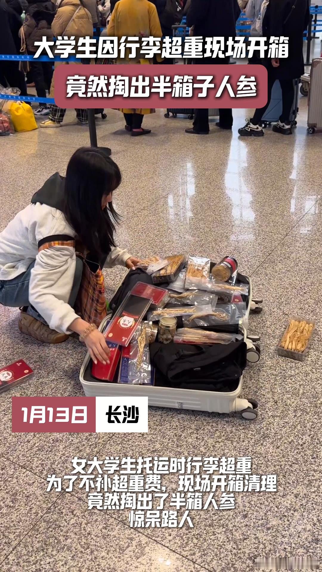 大学生行李超重掏出半箱人参 大学生买年货有自己的赛道 大学生的年货选择真独特,人参等养生品成主打,不仅健康还时尚,真是让人羡慕不已!