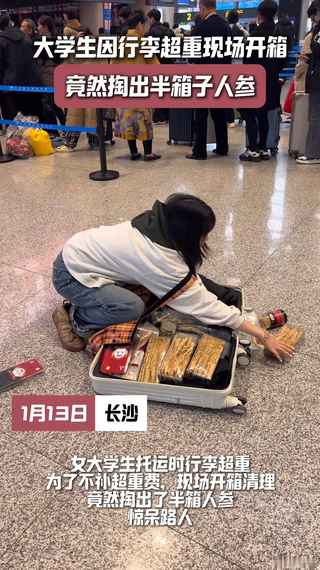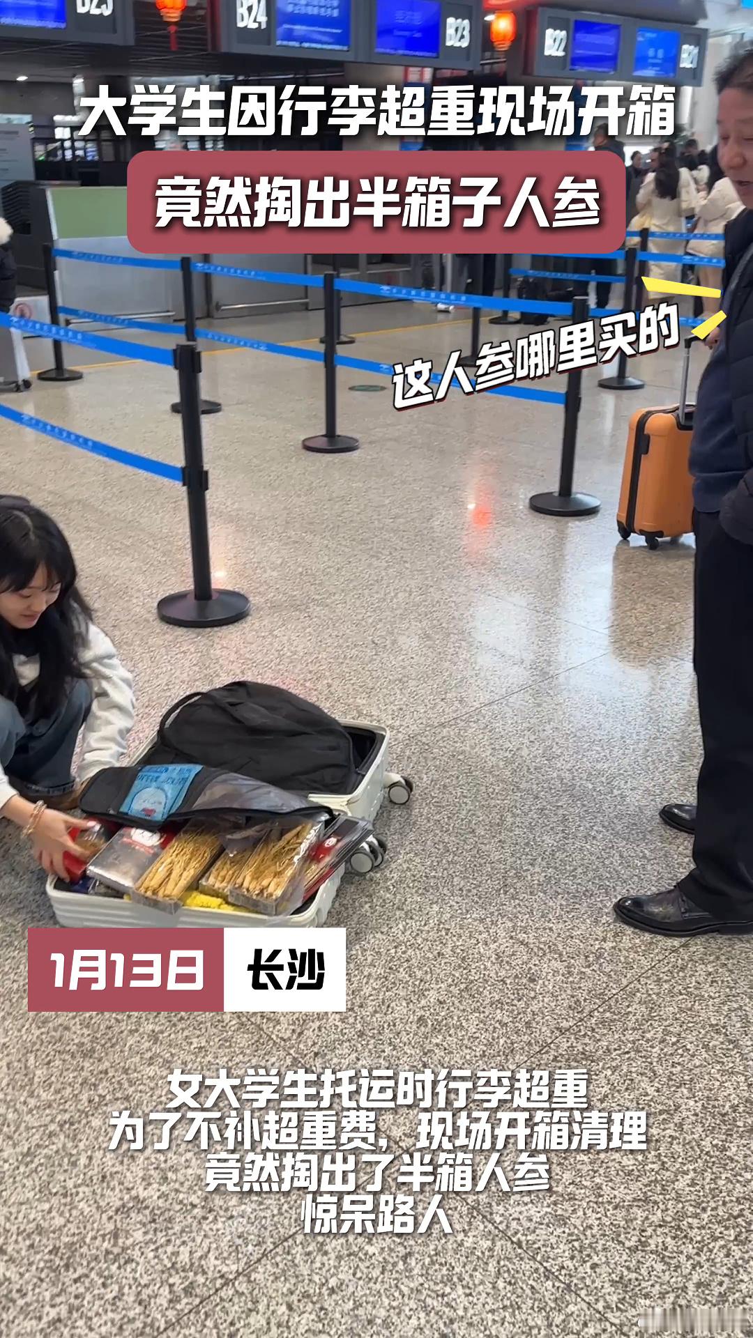 大学生行李箱除了行李什么都有 不得不说,大学生在春运期间的行李箱选择太有个性。人参被装进箱子,这是准备在过年时让家人一起感受养生的快乐 。
