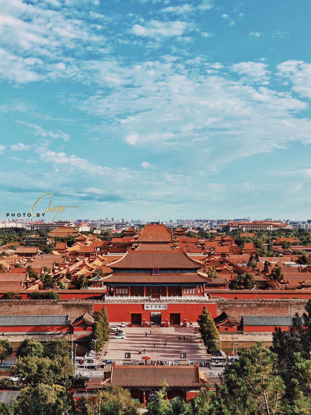 北京旅行 这是两元钱就能看到的风景吗❓逛完故宫登景山, 一直是我北京攻略里不能缺少的行程~ 这个性价比超高的拍照点, 不要错过‼️ . ⛰️景山公园 📍北京西城区景山西街44号 ⏰600—2100 🎫2元(在“畅游公园”小程序或公园大门现场买都可以) . 景山公园地处北京南北中轴线, 中峰的万春亭更是中轴线制高点, 可以把金碧辉煌的紫禁城和现代繁华的北京城尽收眼底~ .