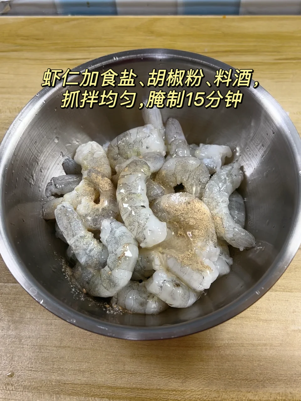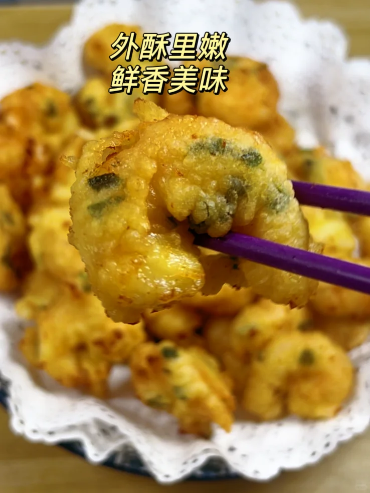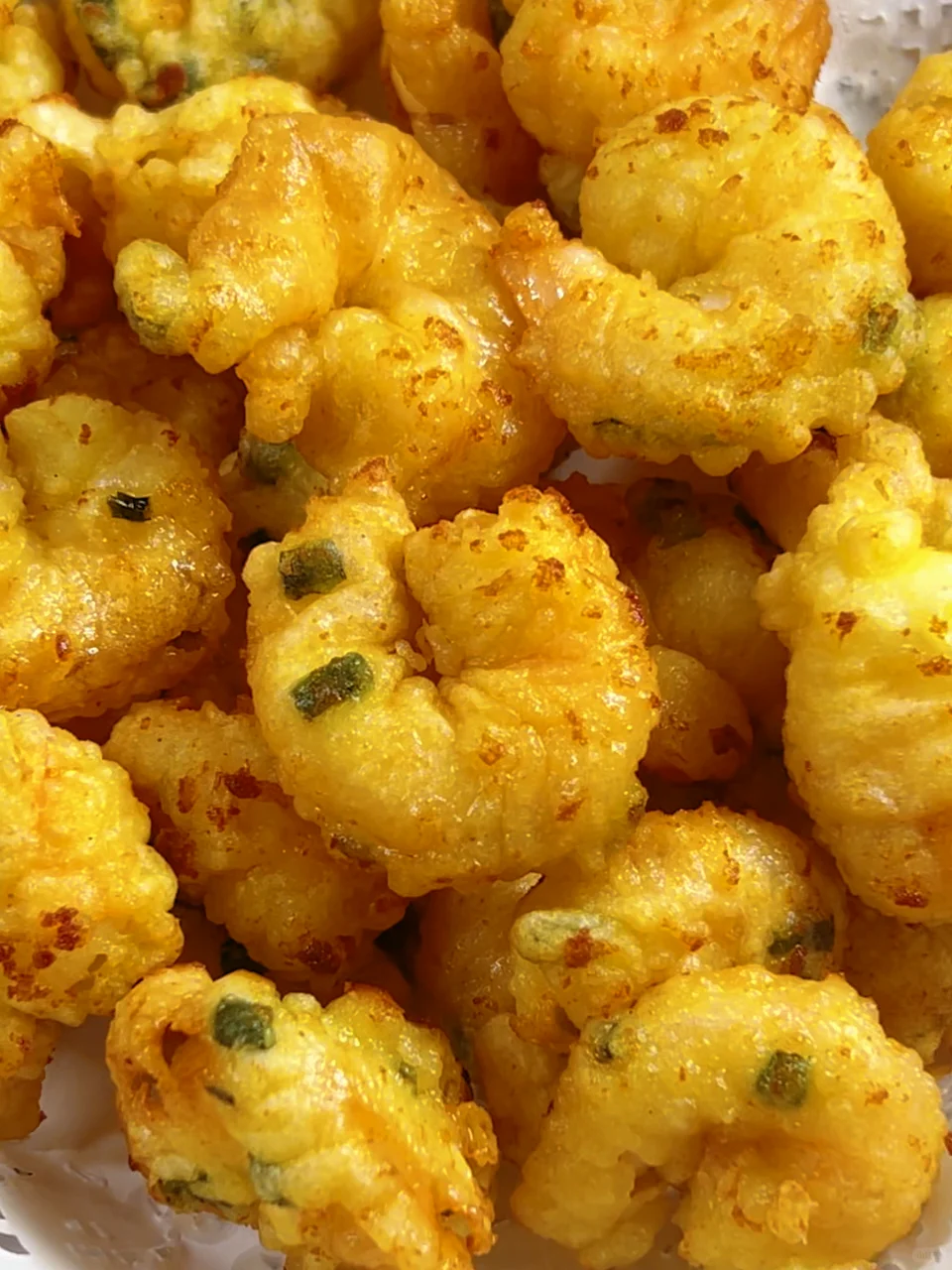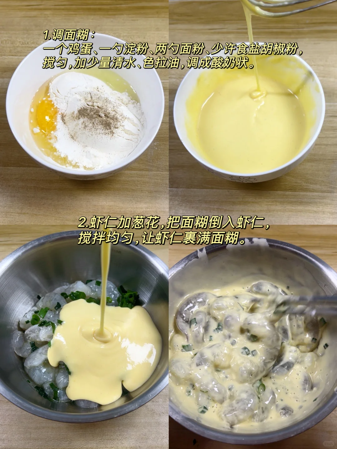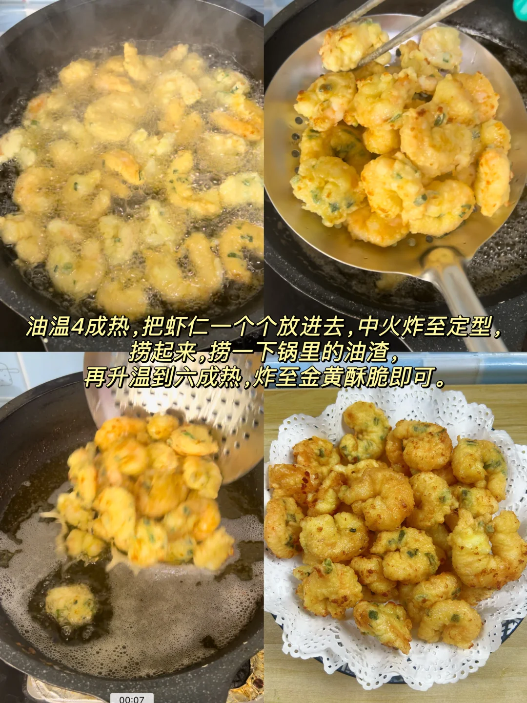 过年做个炸大虾,寓意年年有钱花,外酥里嫩,鲜香好吃。 食材:大虾仁(去线去壳)、鸡蛋、淀粉、面粉、葱花 调味料:食盐、胡椒粉、料酒、色拉油 步骤:1.虾仁加食盐、胡椒粉、料酒,抓拌均匀,腌制15分钟。 2.调面糊:一个鸡蛋、一勺淀粉、两勺面粉、少许食盐胡椒粉,搅匀,加少量清水、色拉油,调成酸奶状。 3.虾仁加葱花,把面糊倒入虾仁,搅拌均匀,让虾仁裹满面糊。 4.油温4成热,把虾仁一个个放进去,中火炸至定型,捞起来,捞一下锅里的油渣,再升温到六成热,炸至金黄酥脆即可。