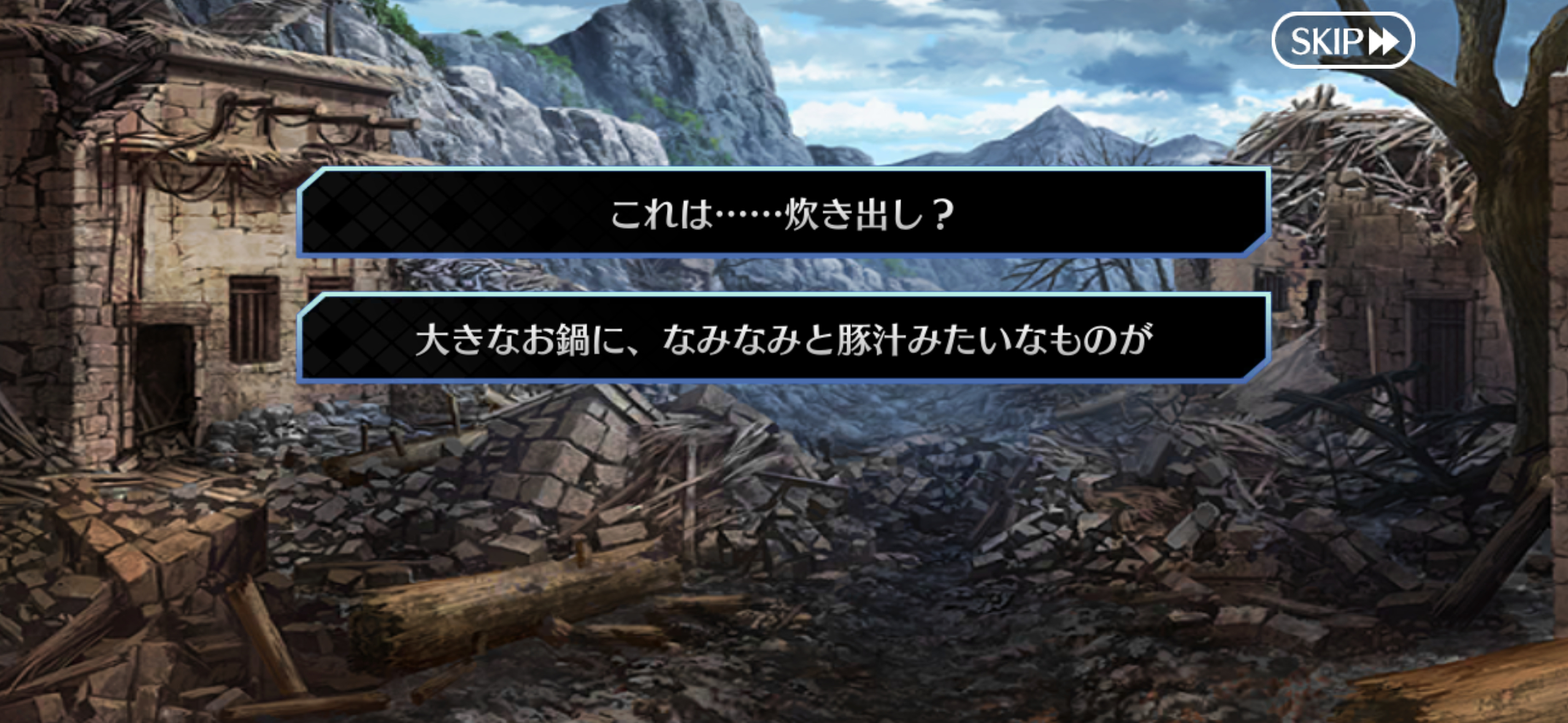咕哒一行发现了香味的来源:分给灾民们的一大锅肉汤。