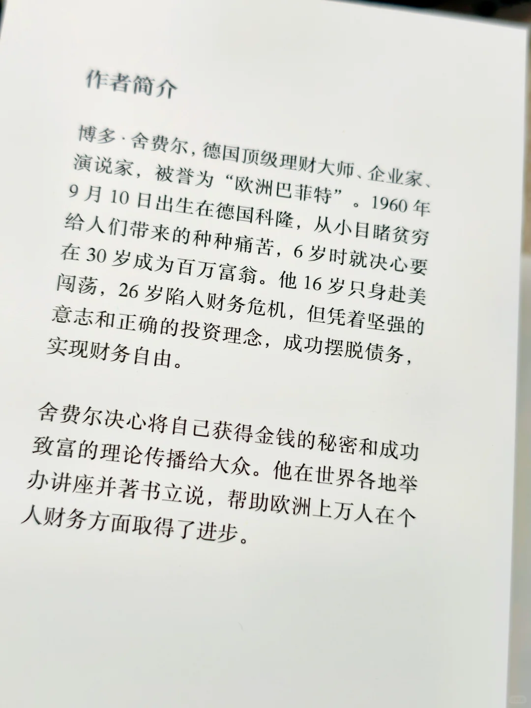 本书作者博多•舍费尔是德国著名的投资家、企业家、演说家以及畅销书作家。从小他便目睹了贫穷给人们带来的种种伤害,这让他厌恶贫穷。6岁时,他决心要在30岁时成为百万富翁。16岁时,博多只身远赴美国闯荡。26岁时,他陷入了严重的个人财务危机。然而,凭借坚强的意志和正确的投资理念,博多在30岁时摆脱了债务,获得了成功——这时,凭借个人资产产生的利息,他就可以过上富有的生活。