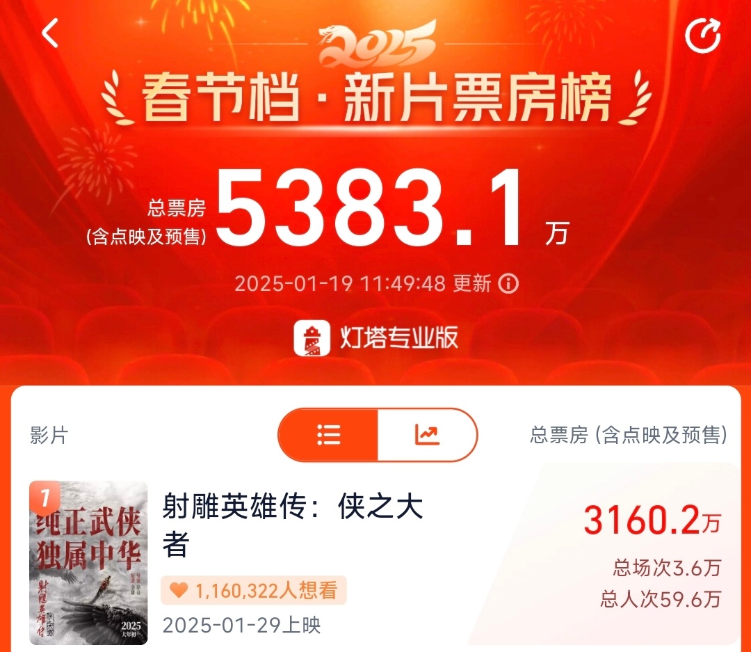 19.9元票价再现春节档 大年初一看射雕,实时预售票房已破3000万!