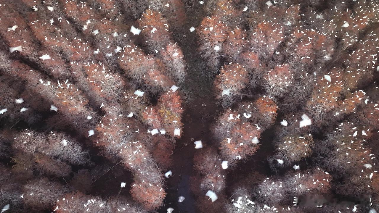 1月17日,广东中山坦洲镇,大涌口灯笼水闸沿岸落羽杉层林尽染美如画,摄影爱好者进入杉林沉浸式体验冬日美景。中山 落羽杉