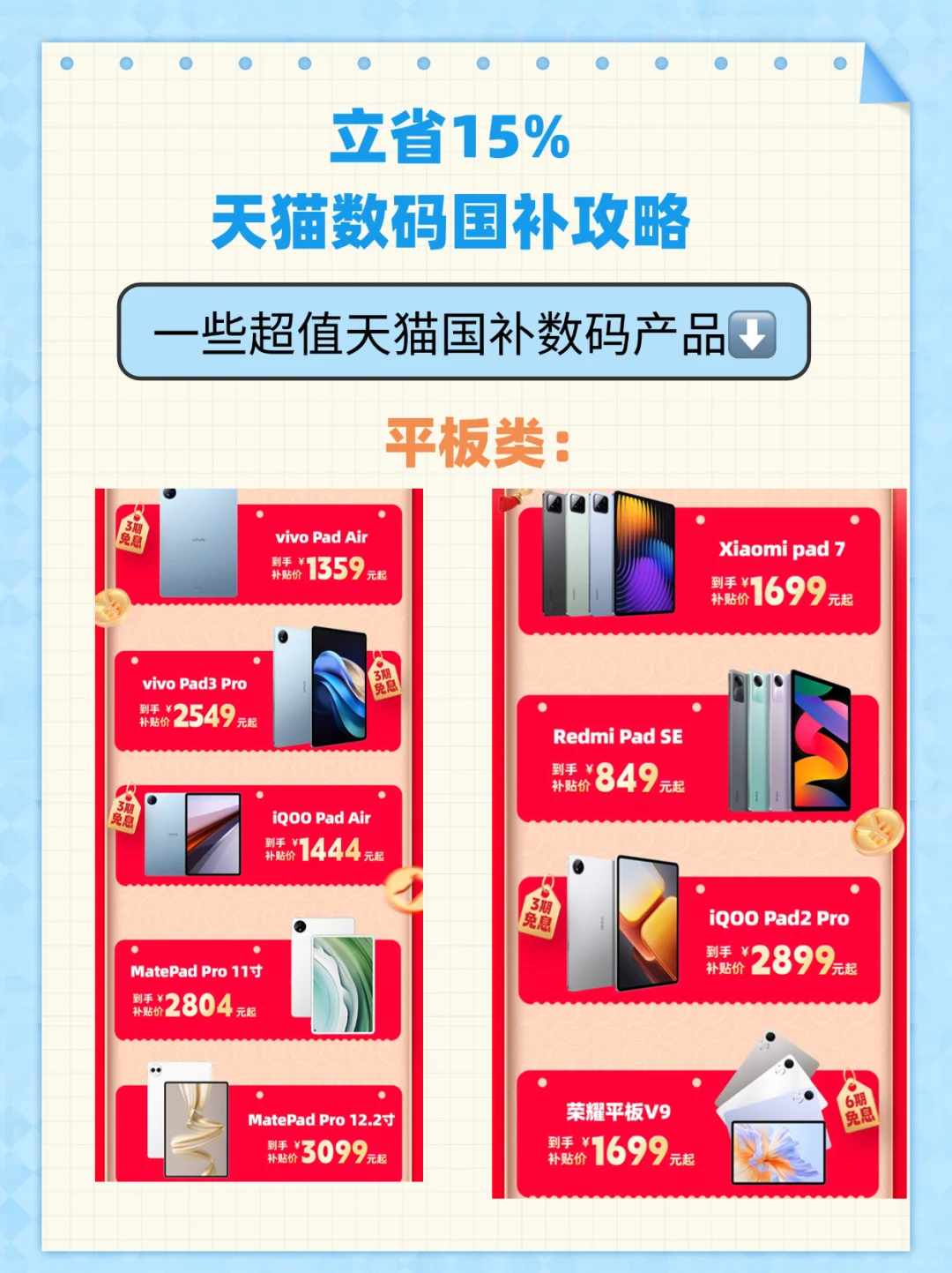 例:淘宝🔍平板政府补贴➡️进入数码国补会场➡️领取补贴资格或选择心仪产品再领取补贴资格➡️付款时自动抵扣15%,还可以叠加平台优惠以及至高24期分期免息!真的超级香!