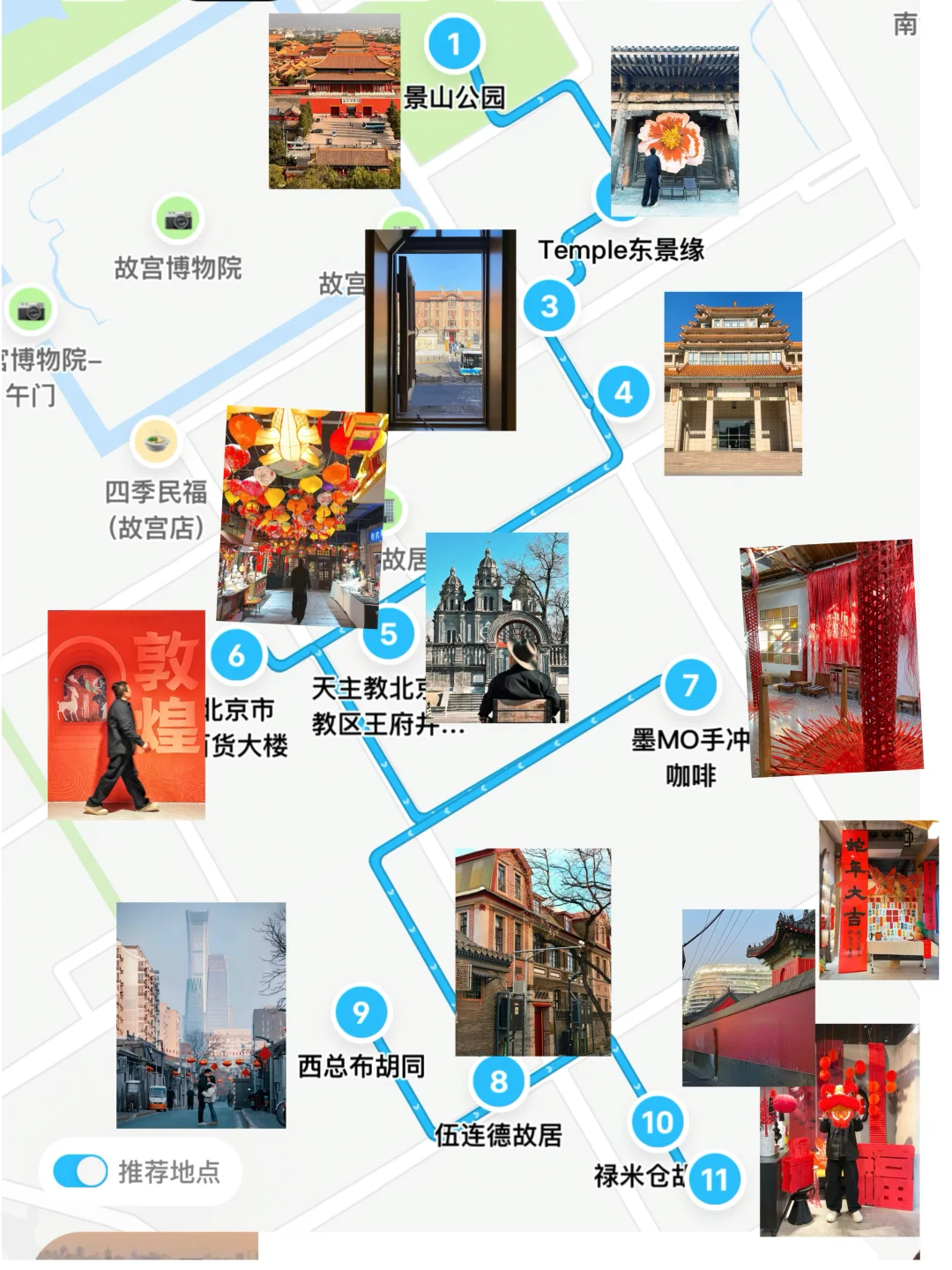 景山公园👉 Temple 东景缘👉北大红楼👉中国美术馆👉 伍连德故居👉百货大楼(敦煌站)👉王府井教堂👉西总布胡同👉禄米仓胡同👉智化寺