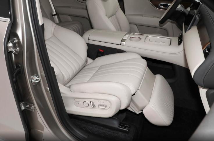 在座椅的用料和设计方面,前排座椅采用Nappa真皮包裹,触感柔和细腻,填充也较为柔软,同时支持加热/通风/按摩功能,副驾驶座椅还额外配备了零重力模式,且靠背、坐垫、腿托等区域均可加热,相比传统的单区域加热来说,寒冷天气条件下保暖驱寒效果更好。除此之外,新车还配备了副驾驶座椅后排金属小桌板,后排座椅靠背角度支持电动无级调节,倾角最大137°,“葛优躺”也不是什么难事,配合后排17.3英寸吸顶娱乐屏来看,座舱豪华感符合预期。