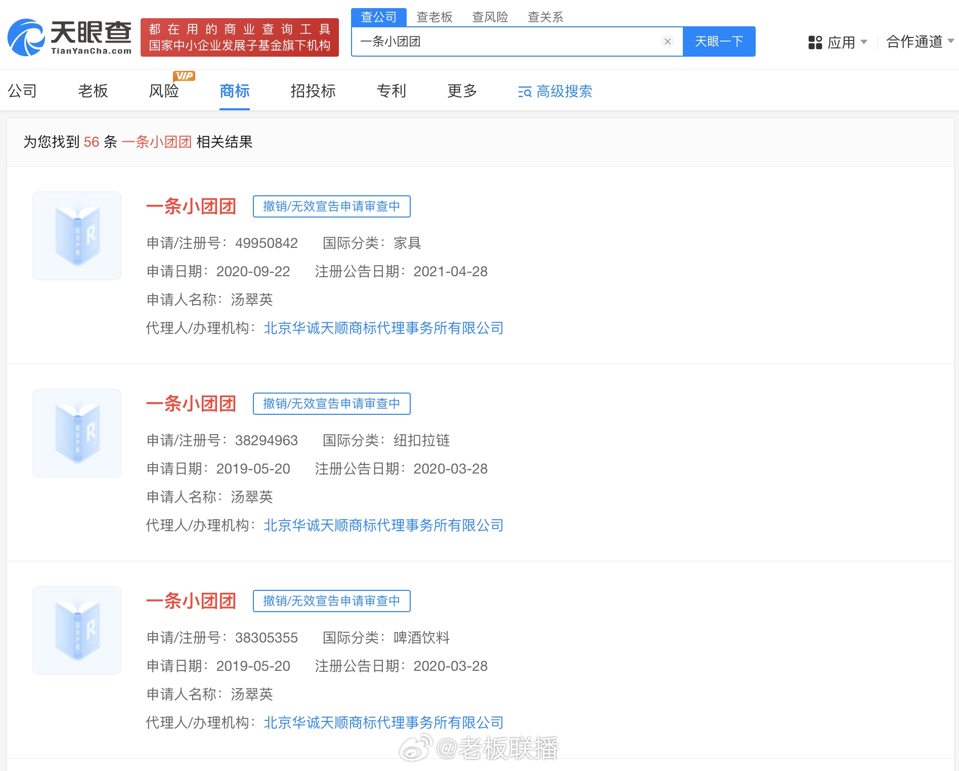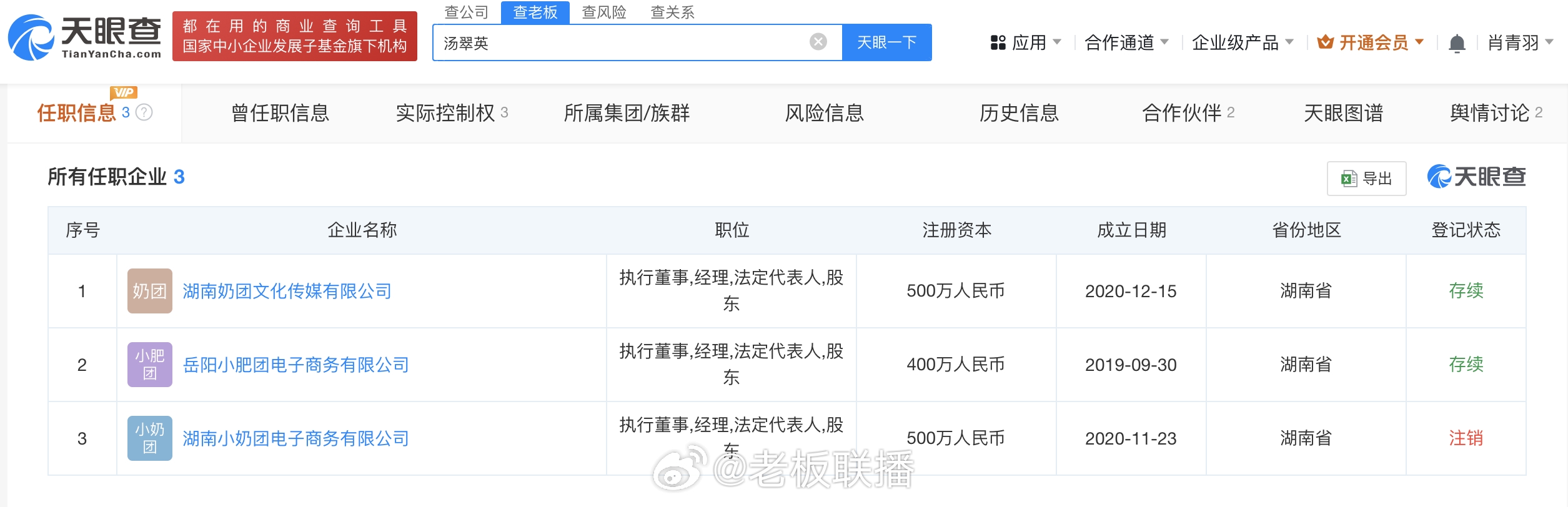 天眼查App显示,“一条小团团”商标申请人汤某某名下共关联3家公司,除已注销的湖南小奶团电子商务有限公司外,其余两家湖南奶团文化传媒有限公司、岳阳小肥团电子商务有限公司均为存续状态。汤某某在上述企业担任法定代表人、执行董事、经理等职务。