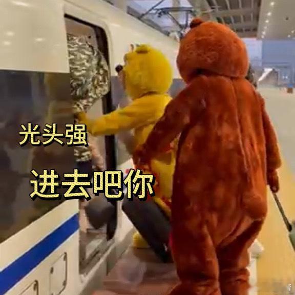 网友高铁偶遇熊大熊二 这年头,连熊大熊二都加入春运大军了。提着行李箱挤进车厢,看