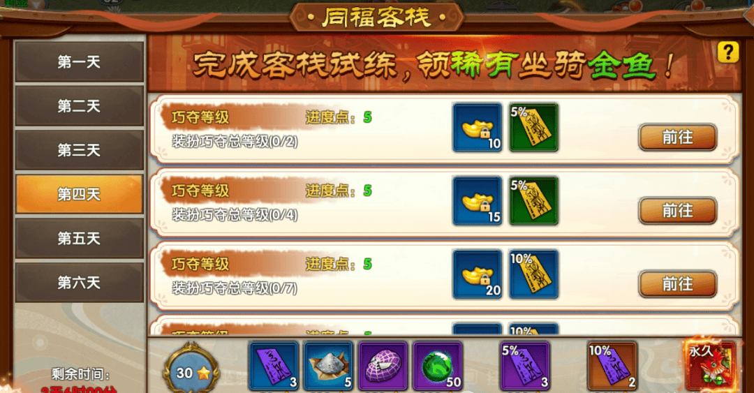 第四天解锁的任务是巧夺天工,为你的时装进行升级,巧夺过的时装会带来数值提升。但巧夺本身成功率就偏低,这个时候使用强运符是不错的选择!这系列任务是装扮巧夺的总等级,所以也建议不要在一件上“死磕”,尽可能多的利用更高的成功率将巧夺等级分布在每一件时装上。时装可以通过首充获取3件,武林庆典中的第二天可以领取胡子“青青河边草”,武林庆典的捕快商店,通过日常任务积累的捕快证明也可以兑换2件时装。(任务奖励的魔力之石是强化时装的必要材料)
