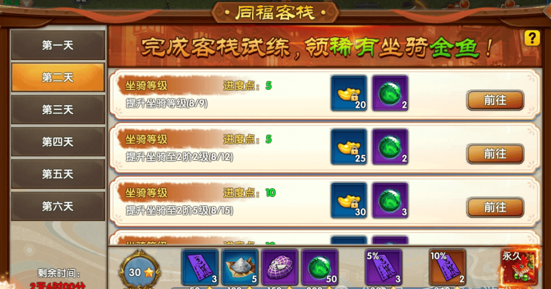 第二天开启的任务是提升坐骑等级。坐骑不仅可以为我们提升移动速度,更可以通过培养额外为主角提供属性加成。通过完成日常任务-武林悬赏的高级及以上任务有几率获得坐骑经验丹,帮派任务中的1级帮派任务是可以必得坐骑经验丹的,不过如果帮派升级了,可能兑换选择中就会略纠结~有能力的玩家们也可通过珍宝阁获得。