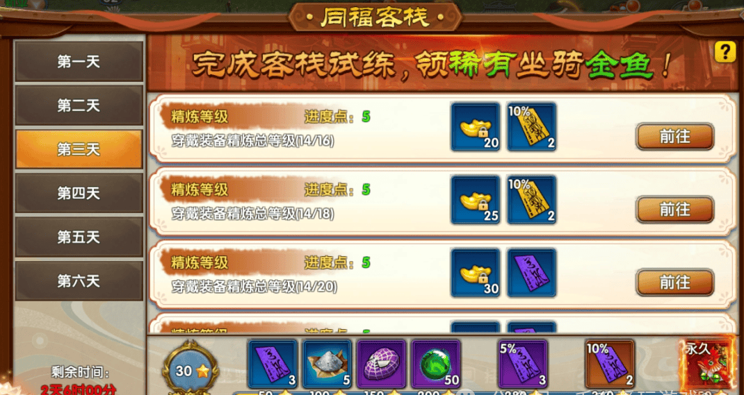 时间来到第三天,在经过前两天的等级提升,开放的装备精炼任务我们早已得心应手,精炼不仅能提升基础属性,还能激活潜在属性,我们可以通过击败野怪,击败首领获得精炼石,使用精炼石对装备进行精炼。随着每次精炼的成功,成功率会大大降低,这时可以通过从珍宝阁中获取或完成任务的奖励“强运符”来提升成功率。而精炼+3的装备想继续提升时,失败会导致装备破碎,任务奖励我们的“保底符”可避免装备的消失。(为了能更多的达成任务,建议每件装备轮流精炼,不要在一件装备上“死磕”导致材料大量消耗,后续资源丰富之后再冲精炼+4以上)
