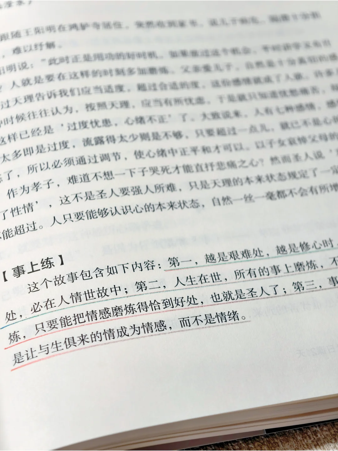 第一,修心收效最高处,必在人情世故中;第二,人生在世,所有的事上磨炼,不过是在人情上磨炼,只要能把情感磨炼得恰到好处,也就是圣人了;第三,事上磨炼的最终目的是让与生俱来的情成为情感,而不是情绪。