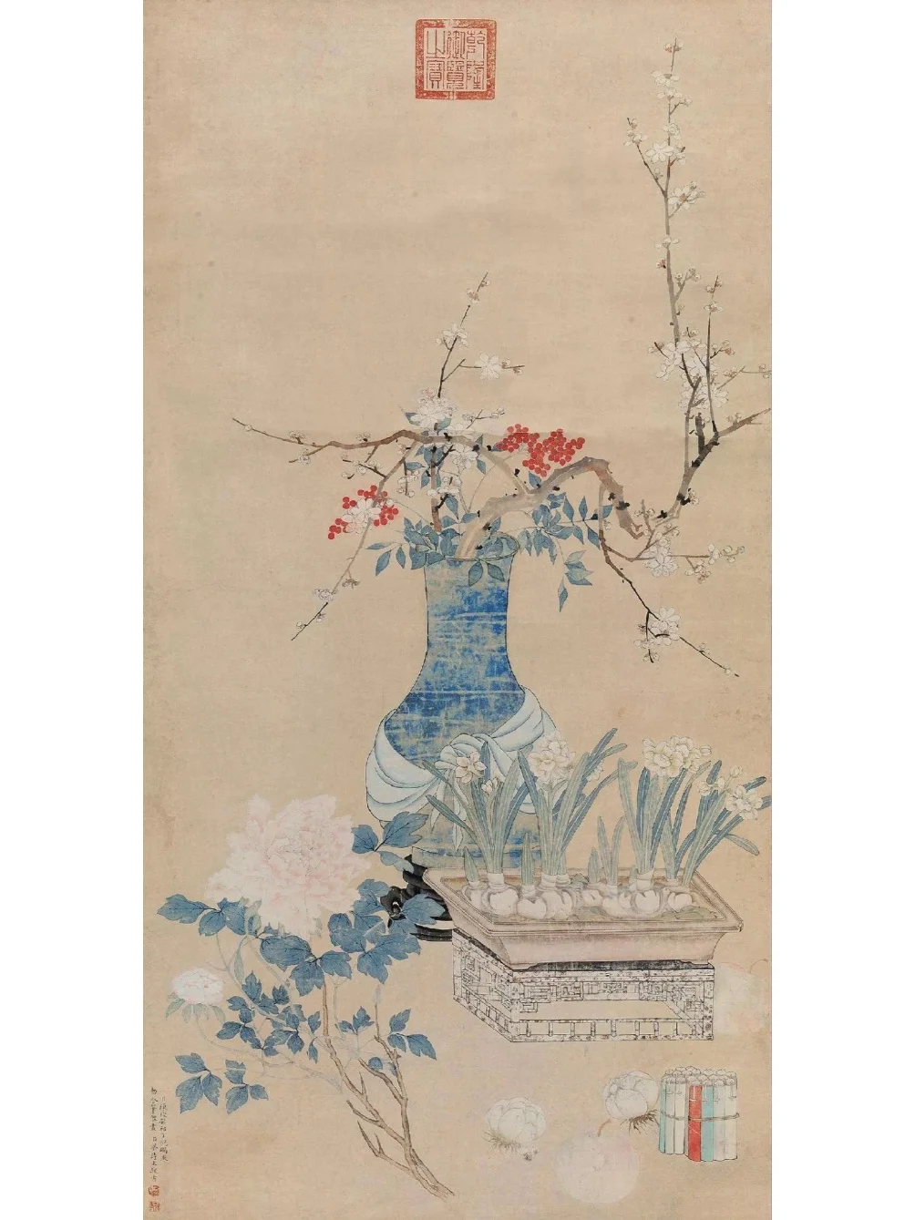 岁朝清供是中国古代的一种年俗活动,起源于唐朝,在宋代开始流行,并在清代尤为盛行。 它是指在农历正月初一,文人雅士会将花卉、蔬果、文玩等供于案前,以显示生机盎然的春意,祈求新的一年里好运连连、平安吉祥。