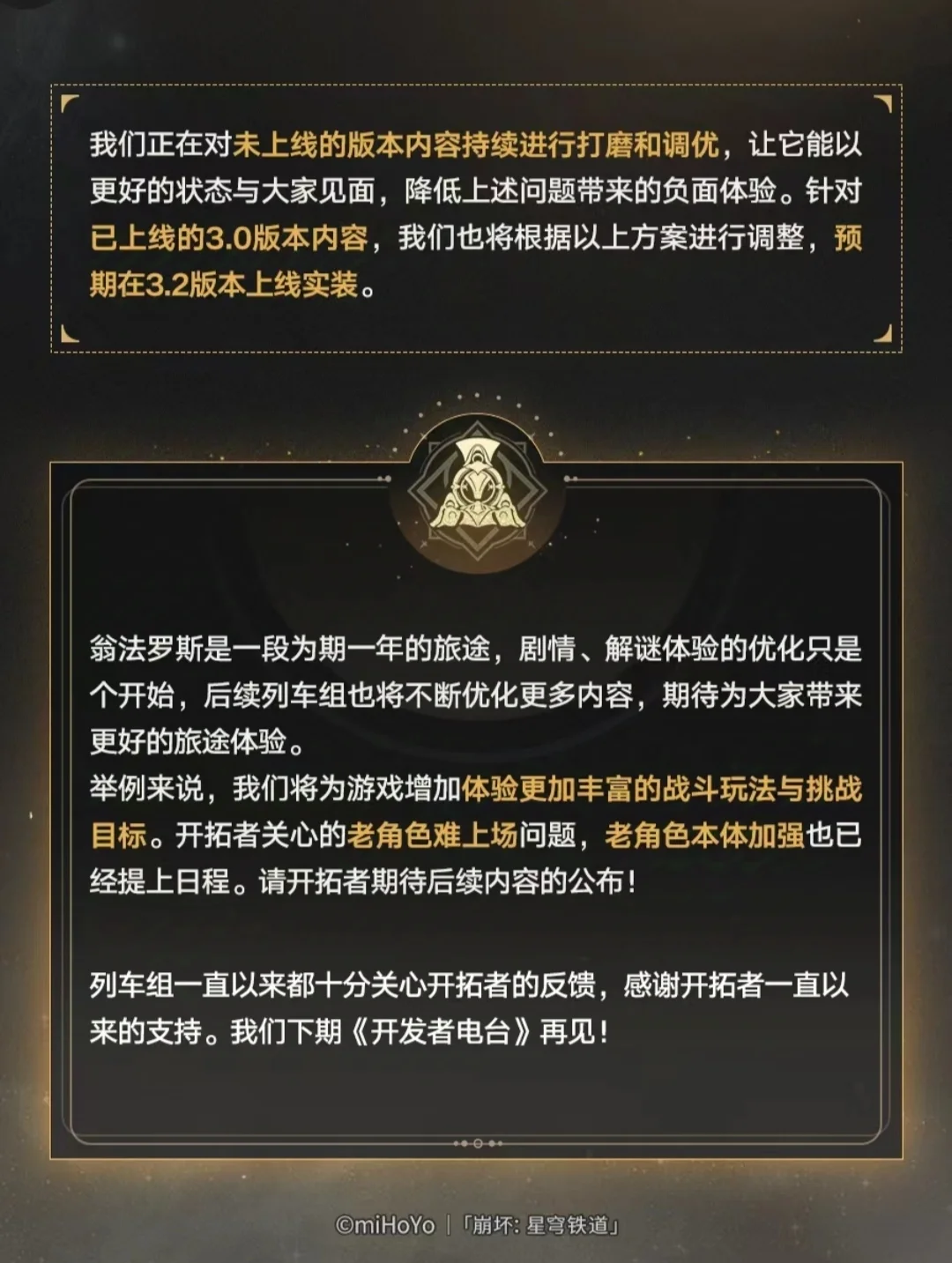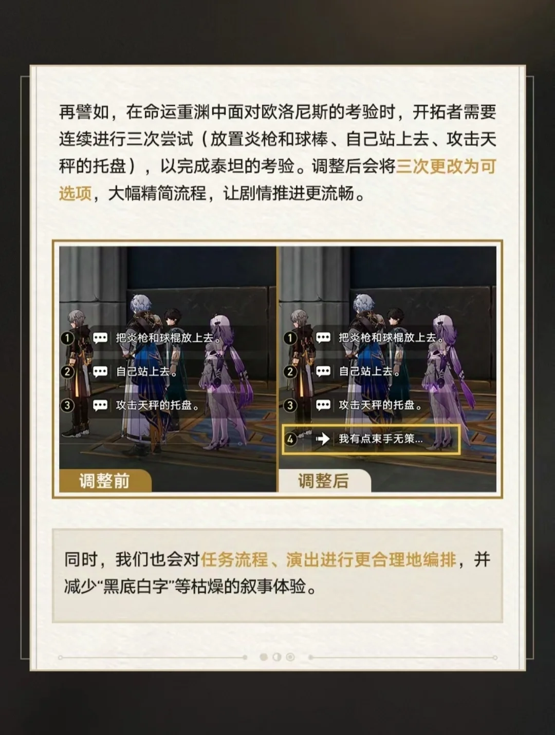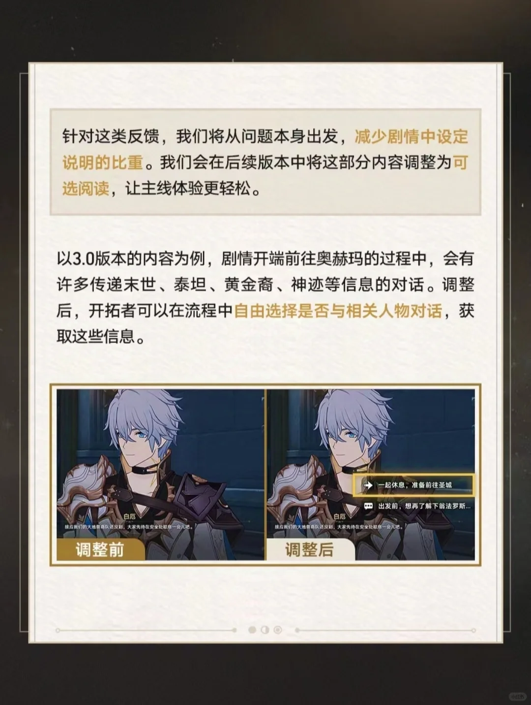 省流: 1、主线设定部分可跳过,精简流程 2、减少黑底白字 3、解谜可选跳过,缩短主线行动路线,减少路上怪物 4、老角色加强!!(景元又要赢了吗[哇R] 3.0版本的内容3.2改好,后面版本直接上线前改掉[赞R][赞R][赞R]