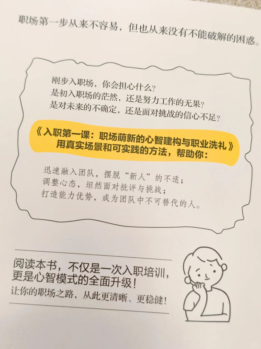 这本书是给职场新人们讲的“入职第一课”,阅读的时候不妨将自己放在“听课席”上,带入其中,去感受这堂大课上职业导师给予的忠告、提醒和叮咛,通过这节课,去完成一位职场新人应有的心智建构和职业洗礼。