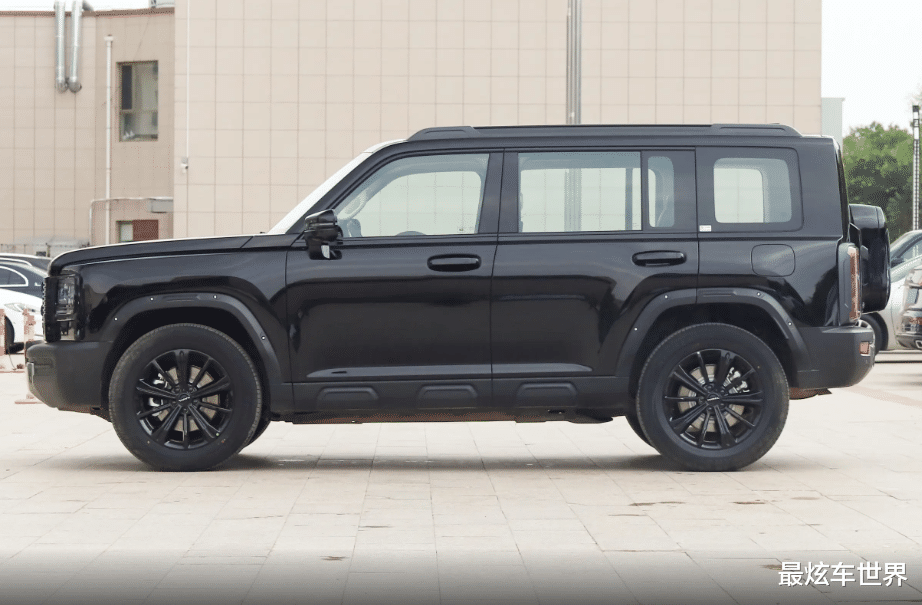 车身侧面依旧是标准的方盒子SUV造型,横平竖直的线条勾勒出棱角分明的感觉,再加上方正的车窗、熏黑侧裙以及外扩式轮眉,粗犷气息扑面而来,有需要的用户还可以自行加装一些改装件,提升实用性的同时户外属性将得到进一步强化,车侧翼子板处增加的摄像头代表该车拥有高阶智能驾驶辅助系统。