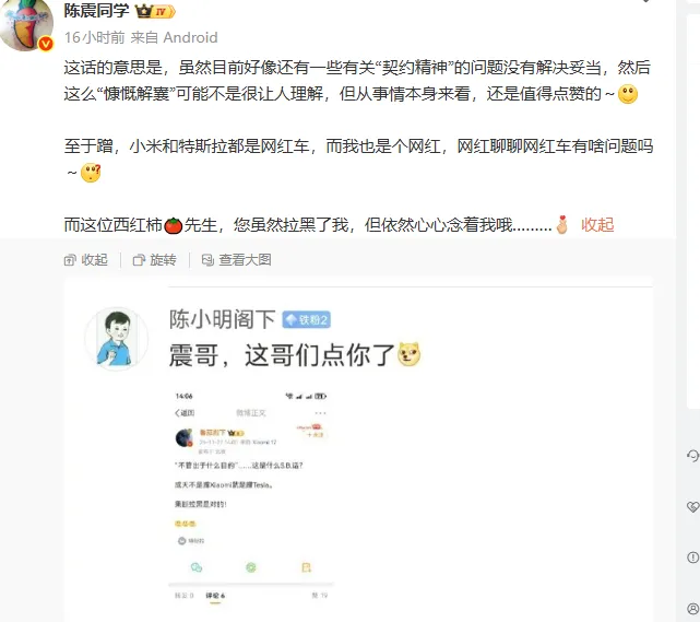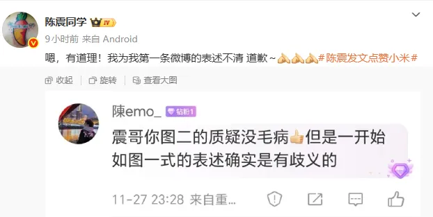 关于被质疑蹭小米流量,陈震表示,至于蹭,小米和特斯拉都是网红车,而我也是个网红,网红聊聊网红车有啥问题吗。但这样的解释,并没有组织舆论海啸,到了凌晨,陈震发布动态,为表述不清道歉,陈震转发网友的说法“震哥你图二的质疑没毛病,但一开始的表述方式确实是有歧义的”表示:有道理,我为我第一条的表达不清道歉。