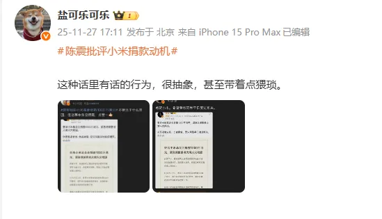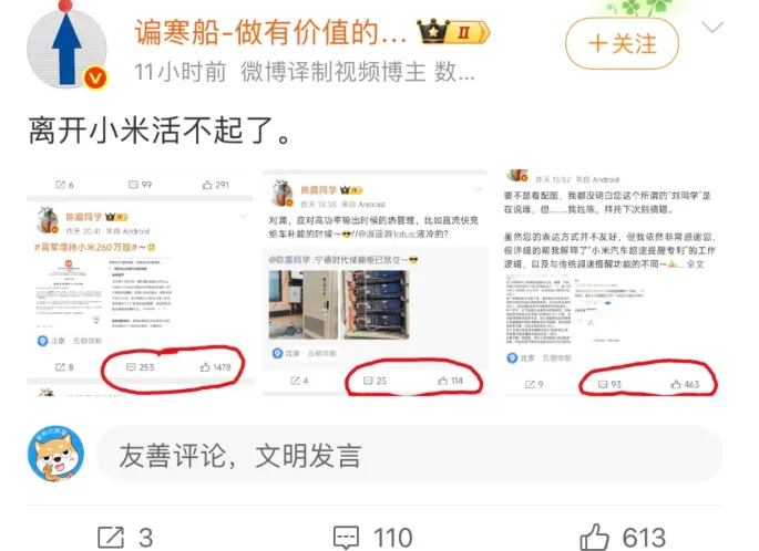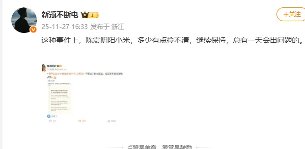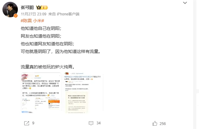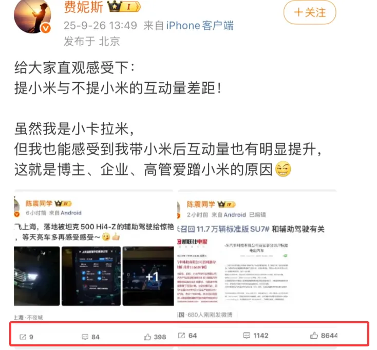 在社交媒体上,不少博主质疑,陈震蹭小米流量,比如有博主观察发现,陈震发小米的内容,互动量是发其他内容的十倍不止。提小米不
