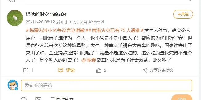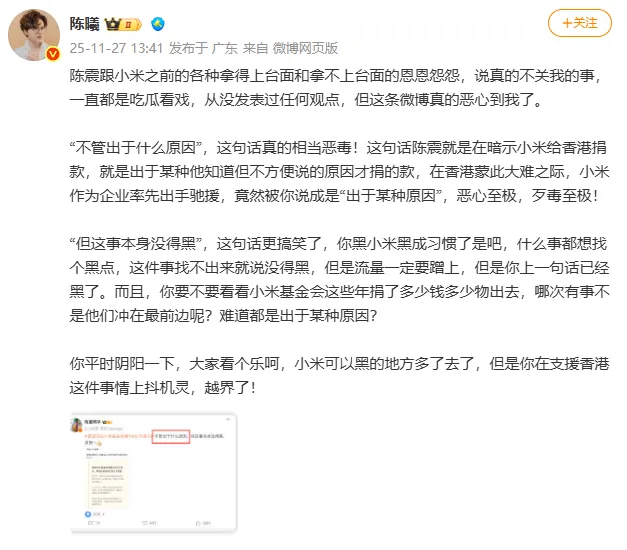 他还表示:“但这事本身没得黑”,这句话更搞笑了,你黑小米黑成习惯了是吧,什么事都想找个黑点,这件事找不出来就说没得黑,但是流量一定要蹭上,但是你上一句话已经黑了。而且,你要不要看看小米基金会这些年捐了多少钱多少物出去,哪次有事不是他们冲在最前边呢?难道都是出于某种原因?你平时阴阳一下,大家看个乐呵,小米可以黑的地方多了去了,但是你在支援香港这件事情上抖机灵,越界了!还有博主表示:这种事件上,陈震阴阳小米,多少有点拎不清,继续保持,总有一天会出问题的。