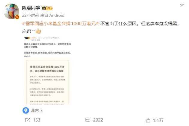 而昨日,小米宣布捐赠1000万港元紧急驰援香港火灾后,陈震也转发了雷军的动态,并表示:雷军回应小米基金会捐1000万港元,不管出于什么原因,但这事本身没得黑,点赞~