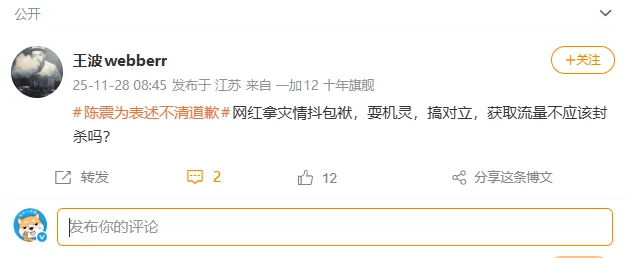 该动态一发,可以说又刷新了陈震近期发文的互动量新高,点赞1.4万,评论高达2322条。然而在评论区,不少用户质疑,前面加一句“不管出于什么原因”有点变味了!有人表示:“你这文案挺招黑的”,有人则回复,明显是故意的,还有人评论有争议的东西是不会发的,要“擦边”