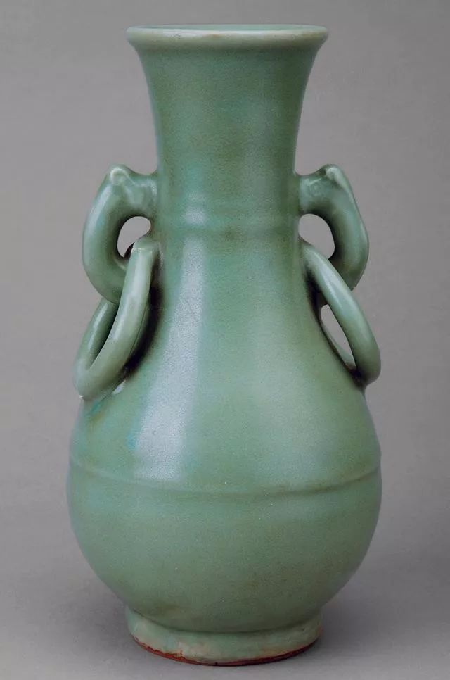 元龙泉窑梅子青釉双耳带环瓷瓶 四川博物院实际上,龙泉窑的瓷器也一直受到宫廷的关注,北京故宫和台北故宫都有为数不少的龙泉窑瓷器收藏,可以说,在龙泉窑的收藏方面,两岸故宫的藏品相映生辉。