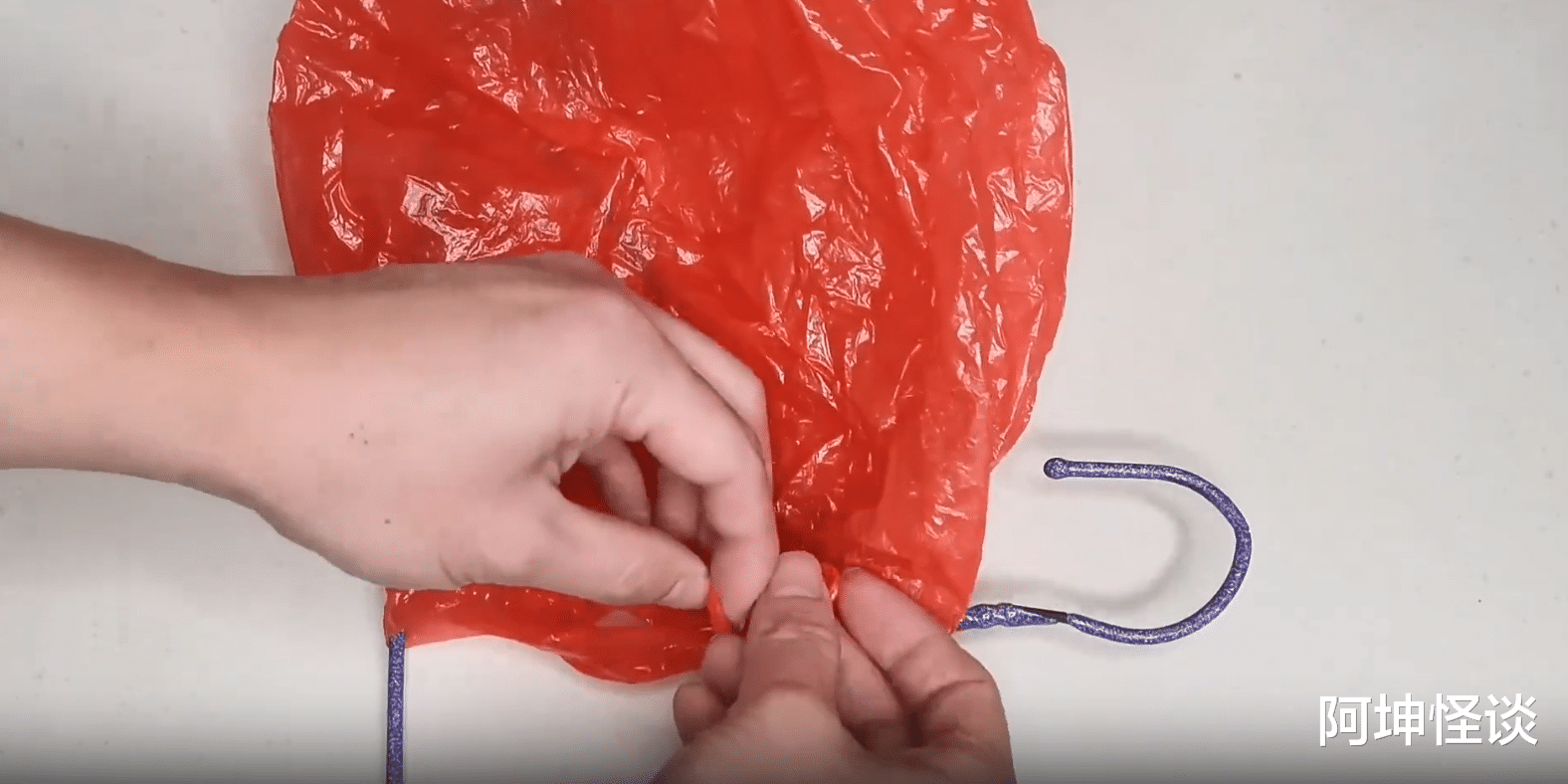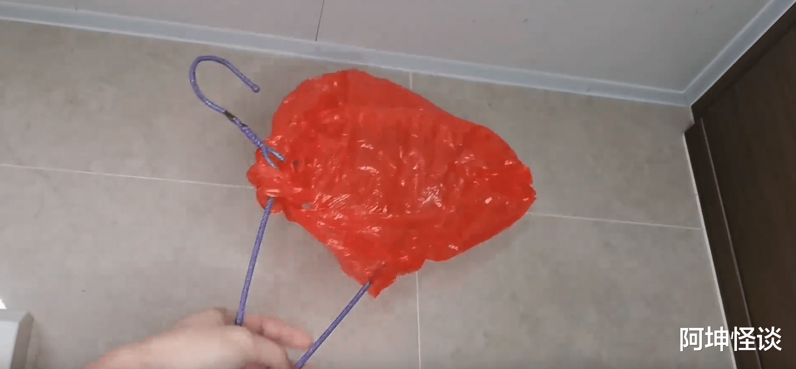 只需一个塑料袋加衣架就能解决。把塑料袋绑在衣架的一角处,神器就制作完成了。