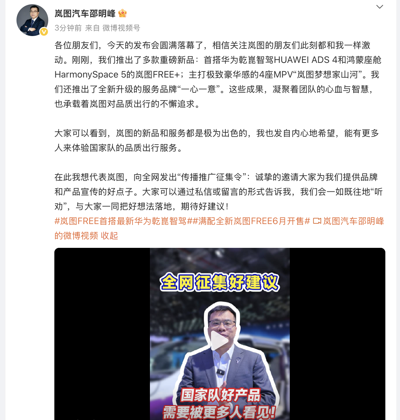 不过,过去岚图虽然产品和技术都过硬,但在宣传上却比较低调,很多人都觉得这么好的车,知道的人却不多,太可惜了。这次,岚图汽车CBO、销售公司总经理邵明峰坐不住了,在社交媒体上发布了“营销征集令”。他直言岚图的新产品都特别优秀,真心希望更多人能体验到。所以邀请广大网友们分享品牌和产品宣传的好点子、推广建议,还承诺会认真听取大家的意见,把好想法变成现实。