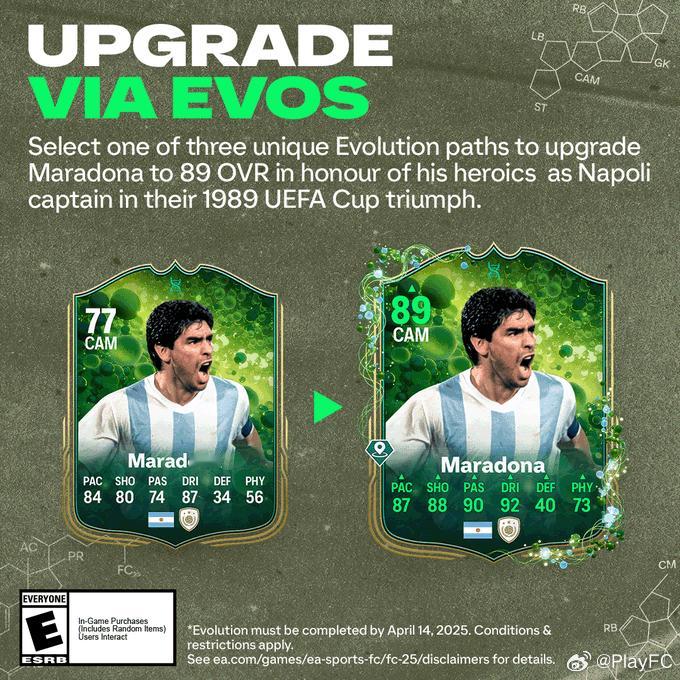 在 3 月 14 日之前玩FC25 Ultimate Team 即可免费领取马拉多纳球员物品,并通过迭戈的梦想进化可以将他提升到 89 OVR。