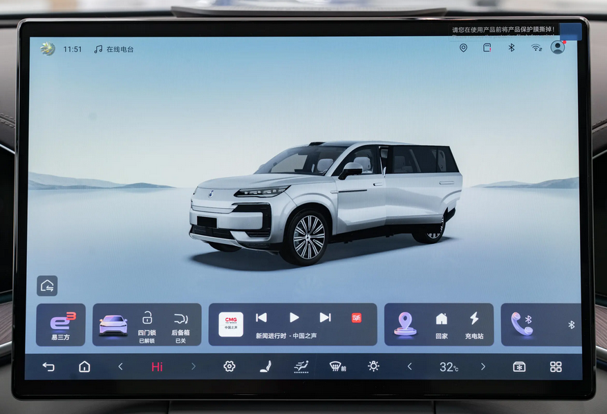在科技配置方面,腾势N9也不含糊。17.3英寸中控屏、13.2英寸全液晶仪表与13.2英寸副驾娱乐屏构成三屏系统,信息展示丰富,操作起来很流畅。50英寸AR-HUD抬头显示,让你不用低头就能看清关键信息。后排还有17.3英寸吸顶屏,看电影、做商务展示都很方便。车内大尺寸无线充电面板,带风冷散热,充电又快又安全。同时保留了一些实体按键,方便司机开车时盲操作,既实用又安全。