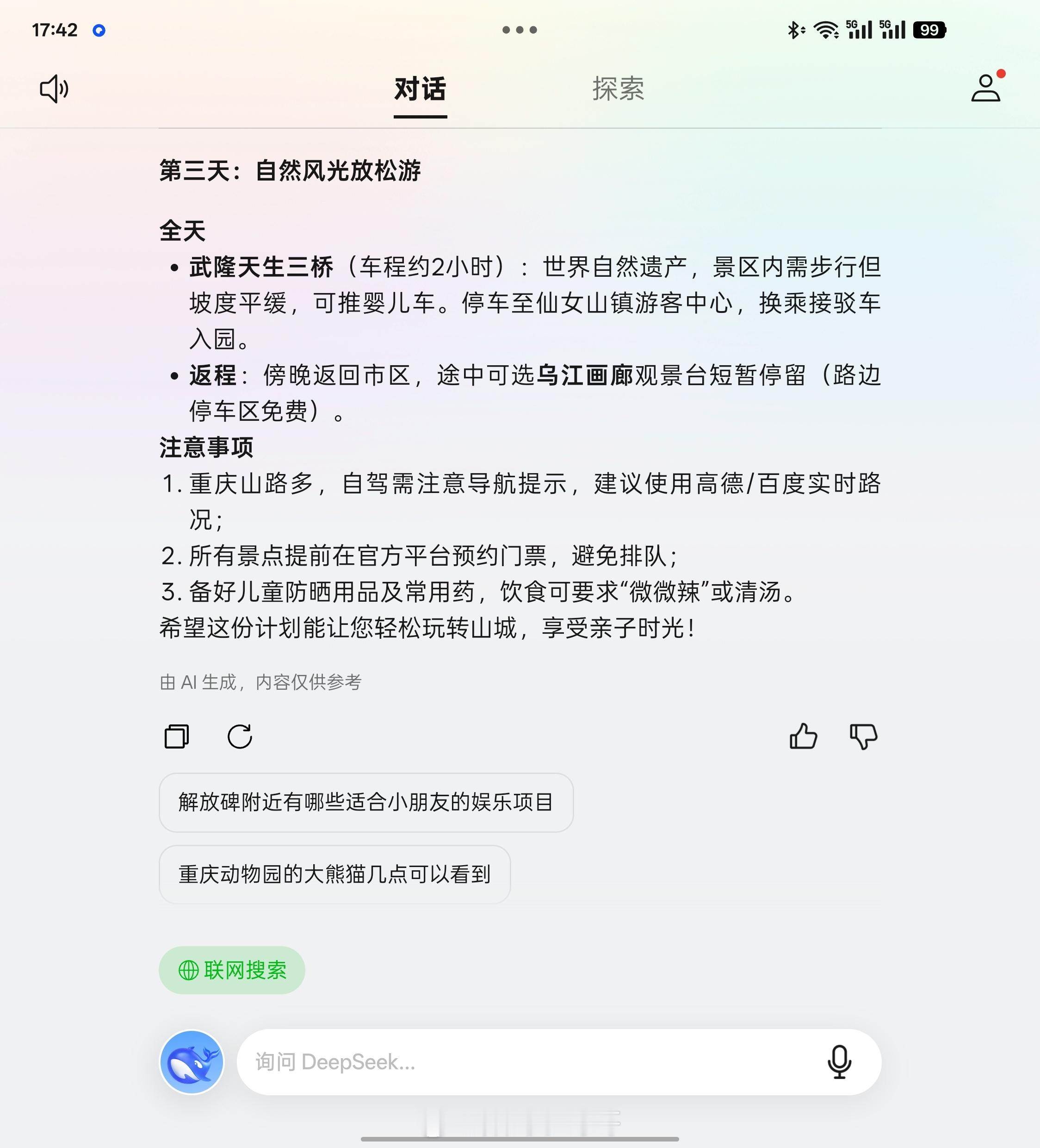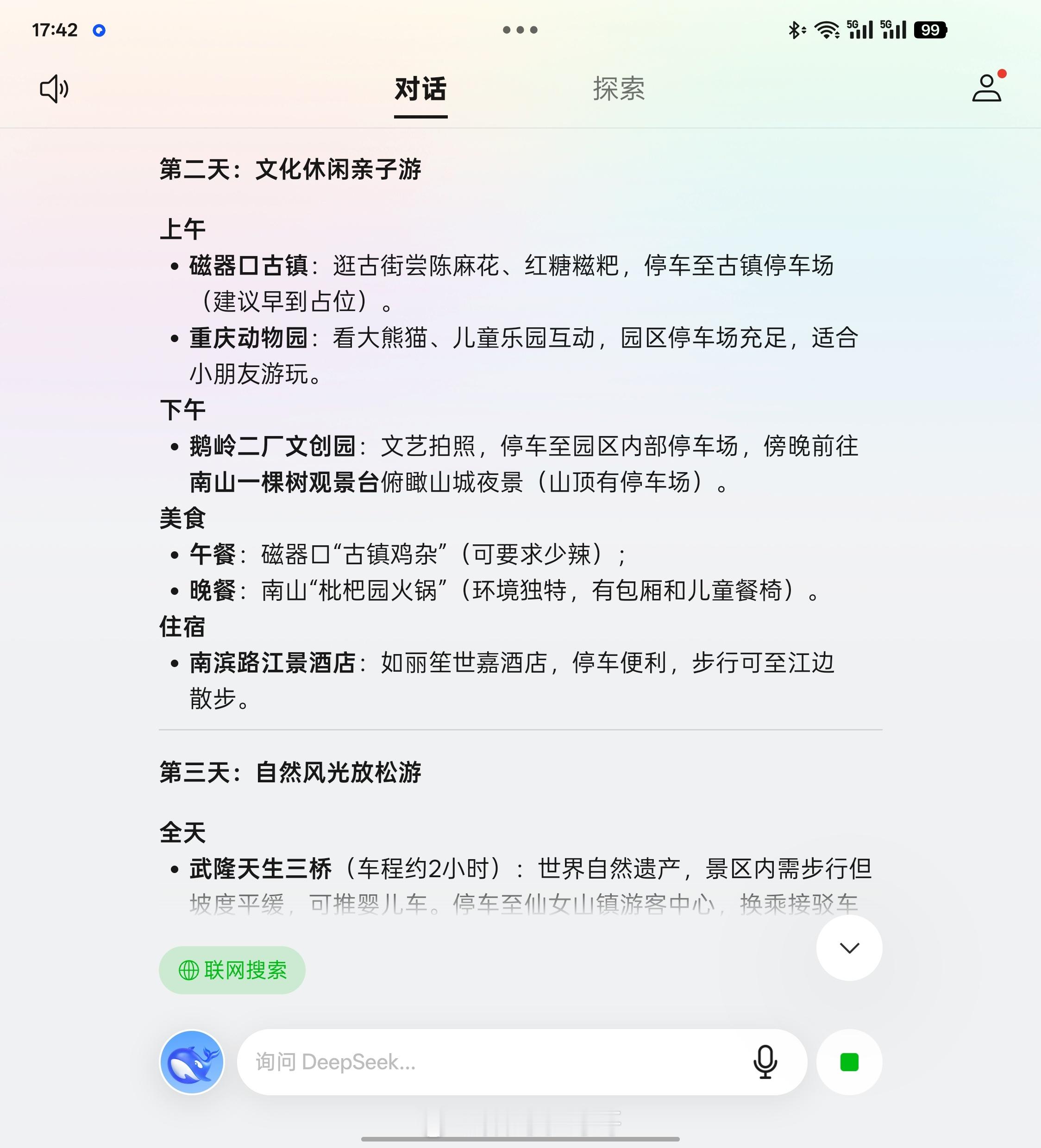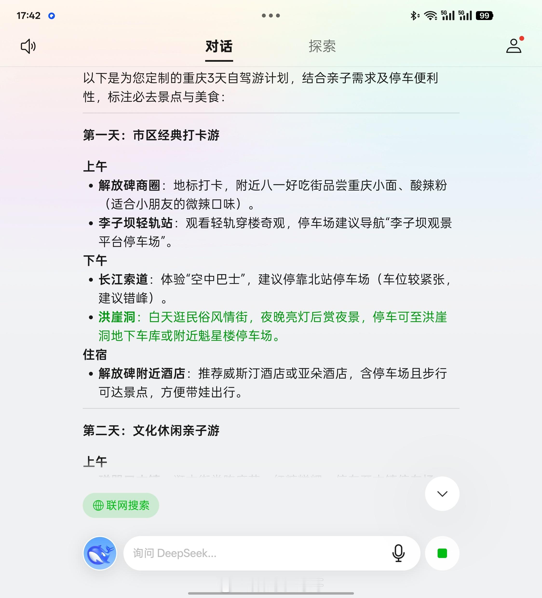 被搭载满血版 DeepSeek-R1 的小布助手惊艳到了!只需简单的输入了诉求,它就帮我定制了超省心的3日行程,连山城复杂路况下的停车点和拍照点都安排得明明白白!全程智能规划路线不绕路,甚至还贴心地标注了各景点自驾注意事项,太实用了~