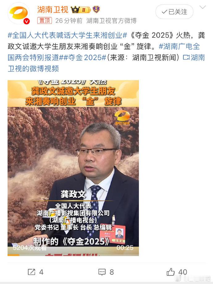 全国人大代表喊话大学生来湘创业 夺金2025全国人大代表龚政文呼吁:大学生们,快来湖南创业,借《夺金 2025》,在创业赛道上绽放光彩!