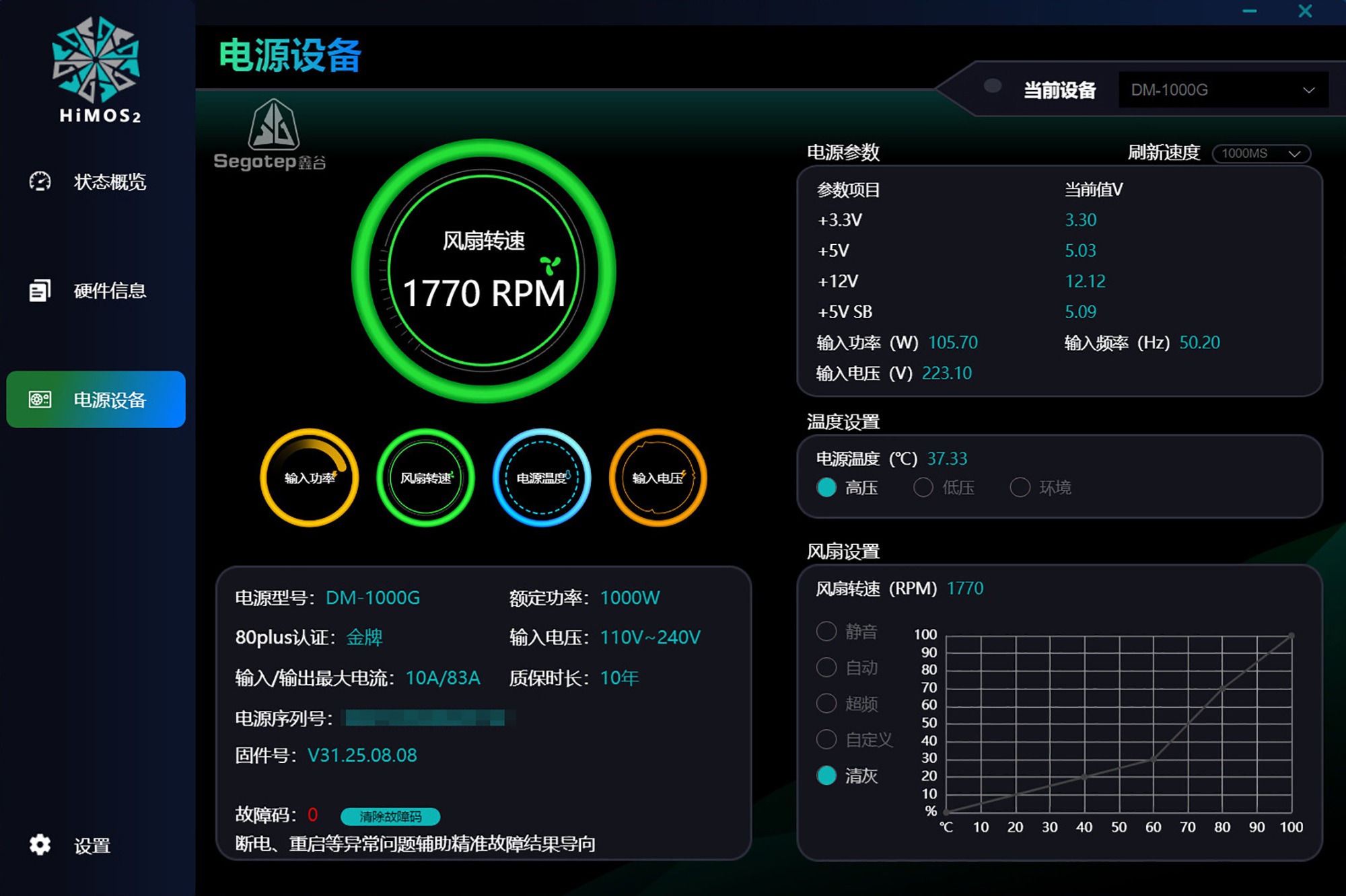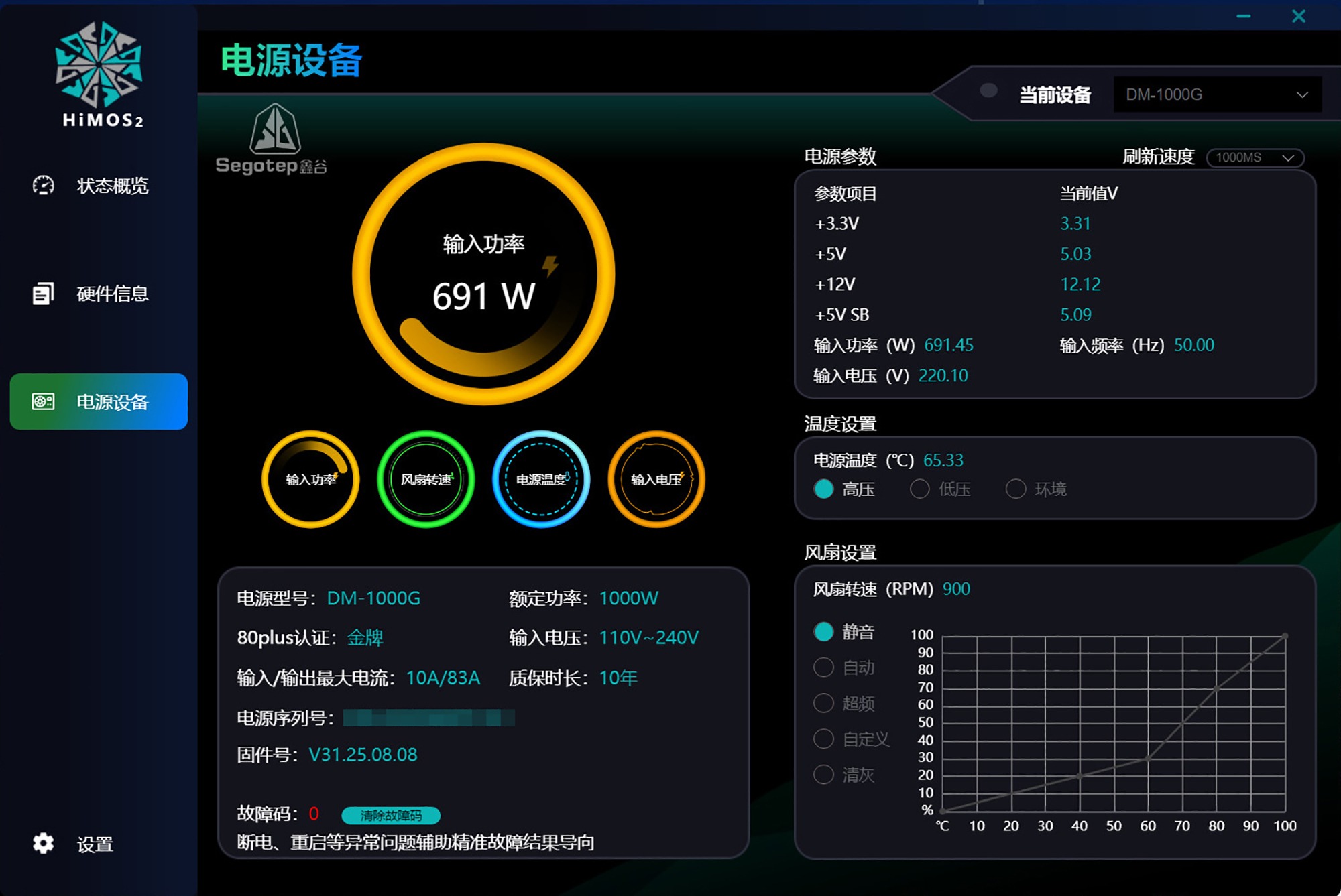 在界面中显示的信息挺全面的,除了电源型号、额定功率与质保年限等常规信息,还显示电源参数,包括输入电压、频率与功率,右下方可调节电源散热风扇转速,系统提供包括静音超频等多个不同运行模式,自定义模式可设置转速曲线,清灰模式会将风扇转速拉满且维持20秒左右。