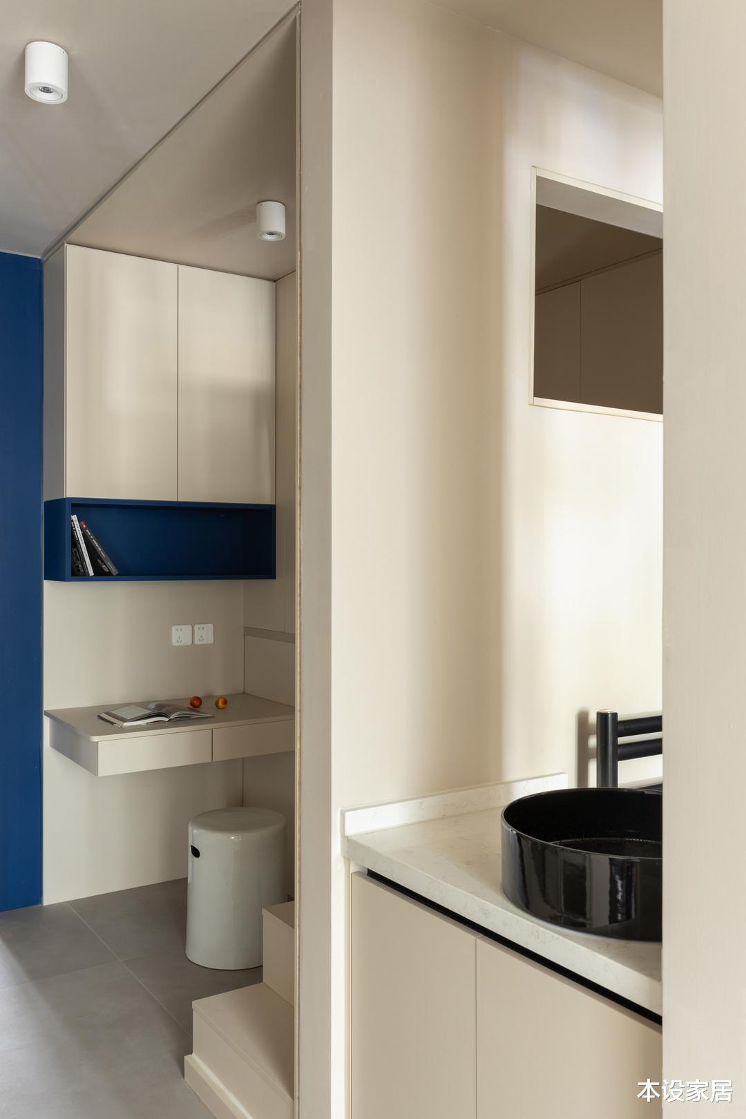 全屋地面铺设灰色瓷砖,大白墙+无吊顶,局部红色和蓝色的点缀,超耐看。