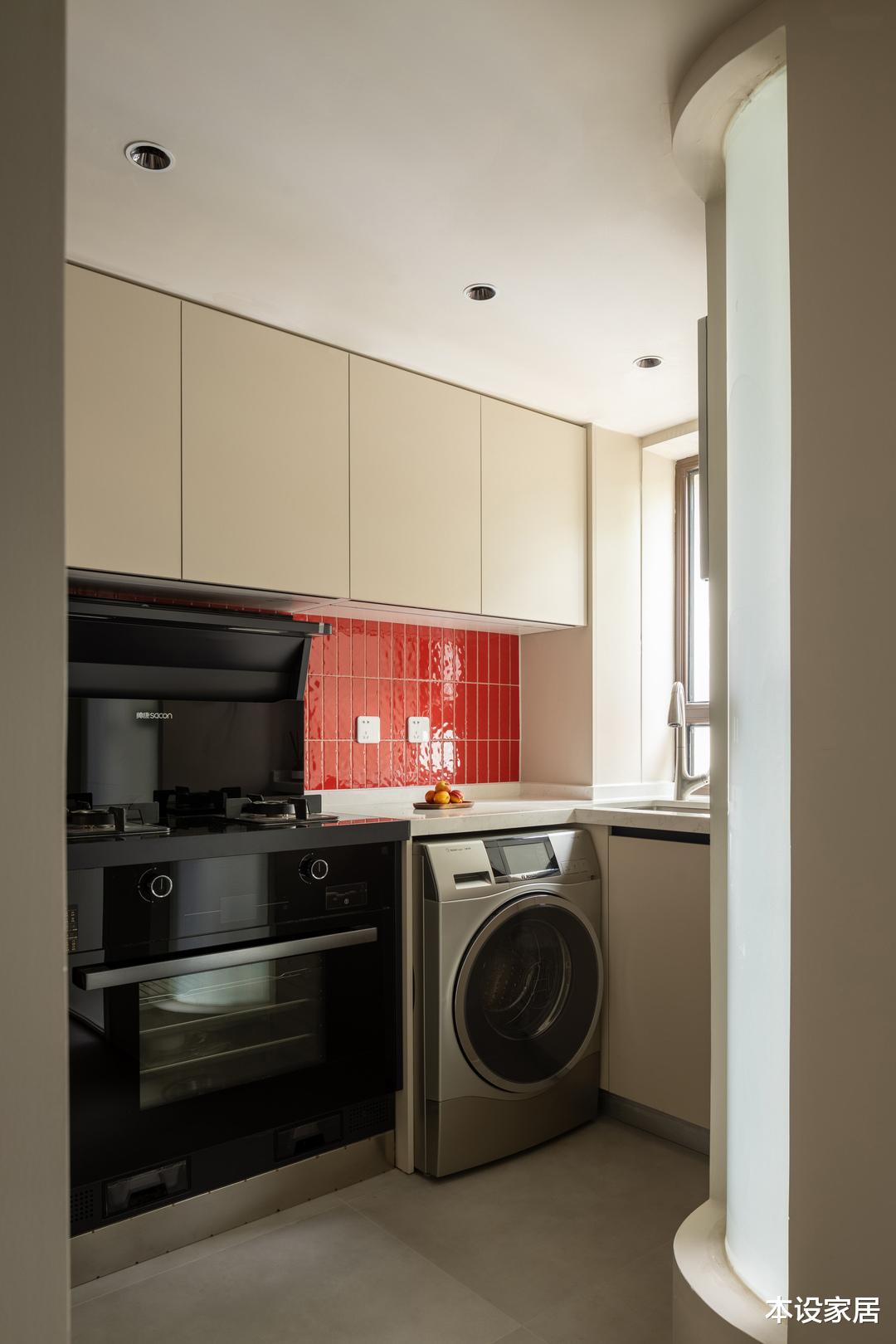 L型的橱柜设计,可以容纳更多的厨房用品和更大的操作台面,乳白色的柜门有提亮空间的效果,再将洗烘机嵌入式安装到地柜中,可以轻松解决上下水问题,也方便日常使用。