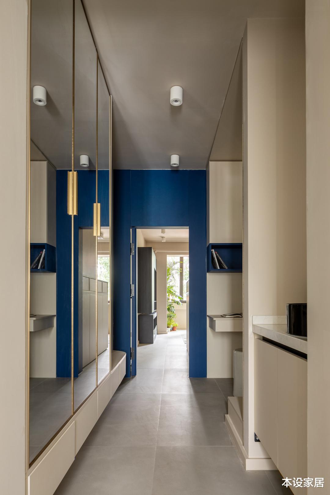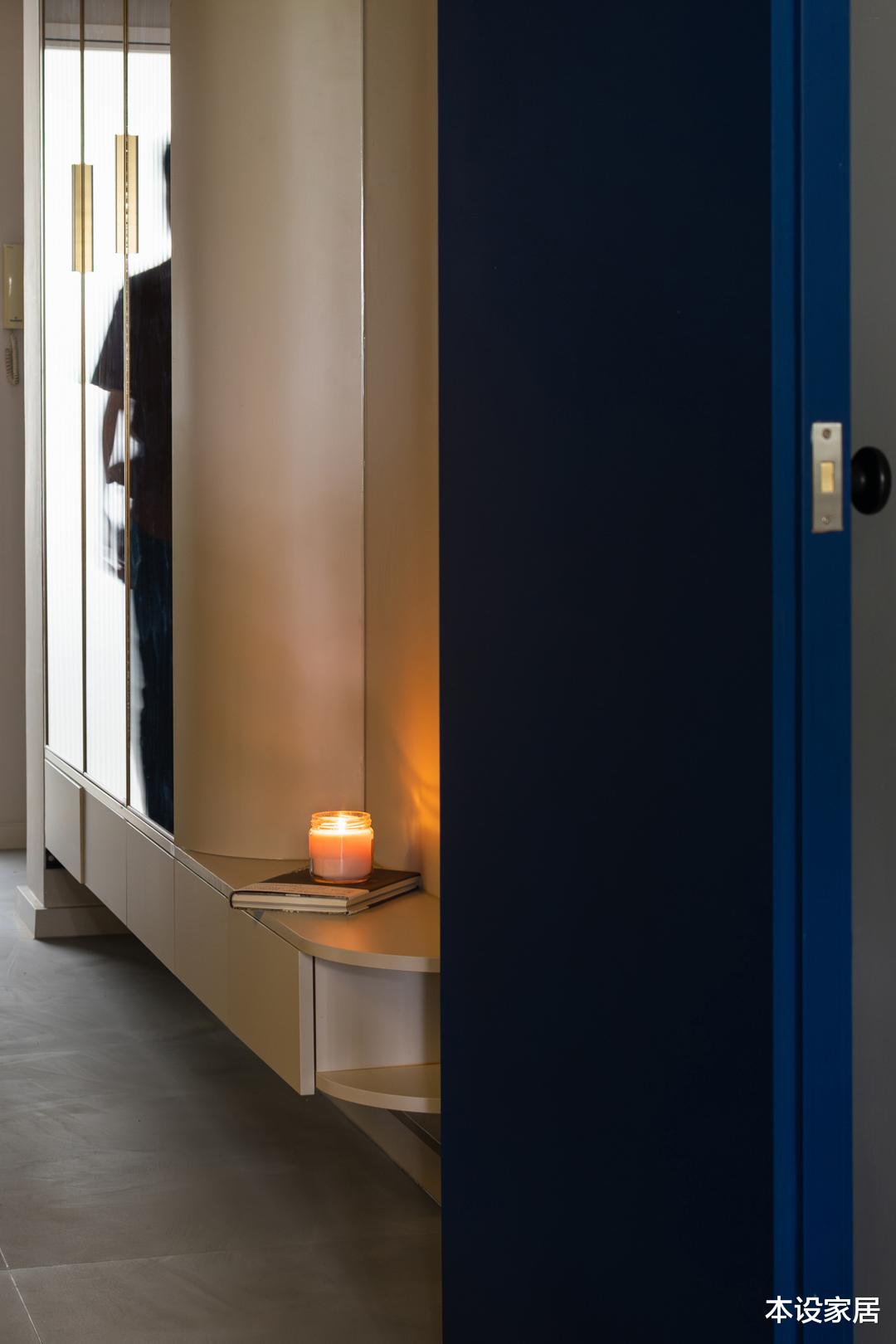 打开入户门,左边是一组到顶玄关柜,与地面保留20公分悬空,刚好放置当季常穿鞋,内部暗藏感应灯带,为晚上回家,或夜间上卫生间提供照明。