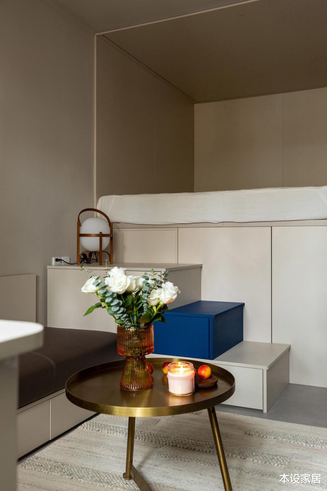 同样是地面抬高1.1米做储物空间,上方是1.8x2米的床架,简单的色彩自带静谧感,简洁的造型,让睡眠更加静心。
