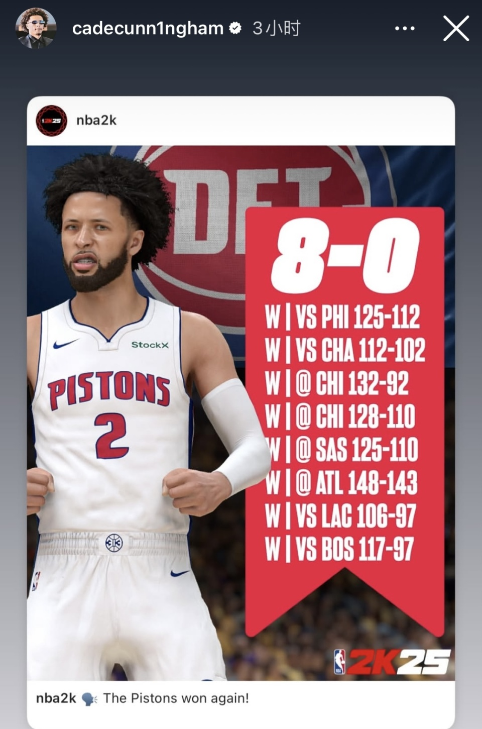坎宁安晒照庆祝球队取得8连胜,从上赛季的联盟最长连败纪录到本赛季东部前六,他率领活塞以黑马姿态打出漂亮的翻身仗。