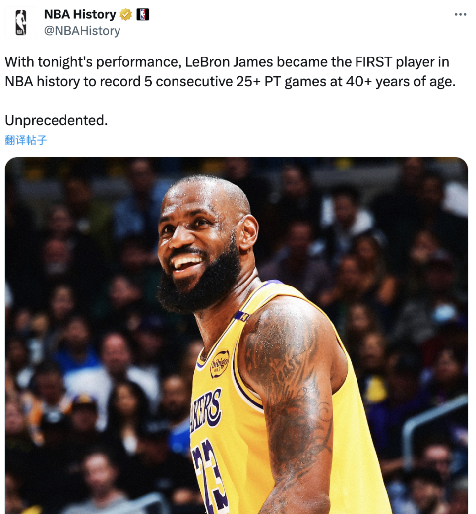 詹姆斯在比赛中拿下33分17篮板,成为历史上首位连续5场比赛拿到25+得分的40岁以上球员。他的表现让许多年轻球员都自愧不如。