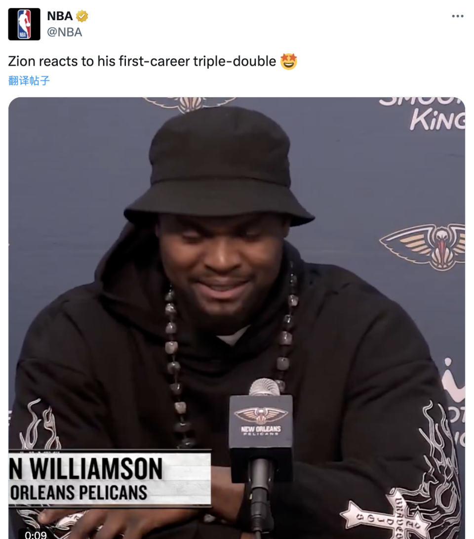 锡安在对阵太阳的比赛中拿到职业生涯首个三双数据。他表示自己并未过多关注这些数据,但感谢教练和队友的鼓励。