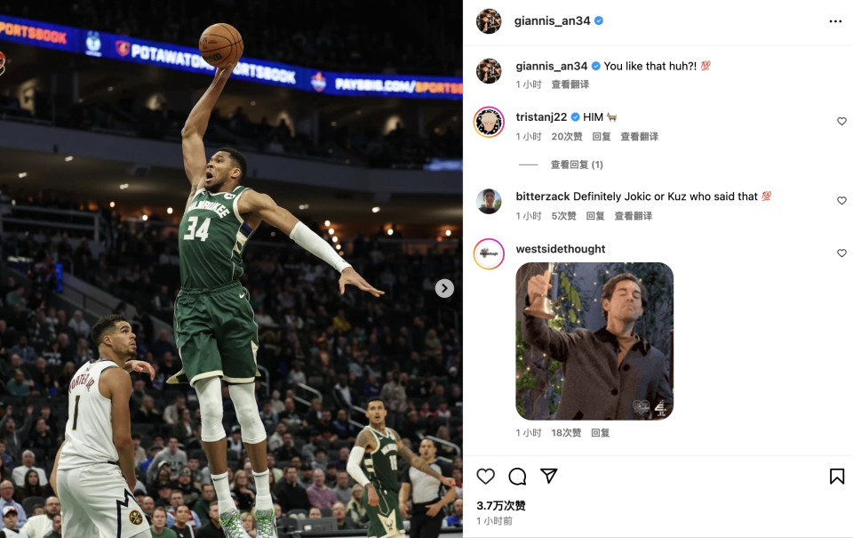 字母哥爆砍28分19篮板,率领球队击败强敌。在与约基奇的MVP榜单前三对话中,他笑到最后,让对手的三双化为乌有。