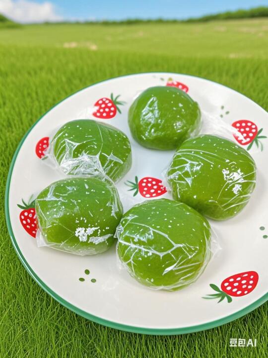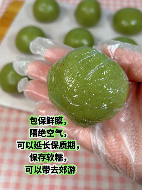 待青团放冷后,用剪好的小块保鲜膜包住青团,如同包棒棒糖一样,将封口处扭紧。