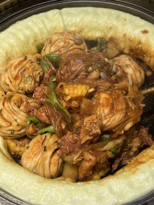 本东北人亲证他们家真的很正宗!! 鸡肉+排骨双拼锅,再加上豆角、玉米、粉条、宽粉…菠菜汁贴饼子和花卷是灵魂!碳水+肉的双重满足谁懂啊😭 还有锅包肉、蘸酱菜、渍菜粉、童年小炸串都挺正宗滴!! 猕猴桃汁酸酸甜甜hin不错,好吃!!