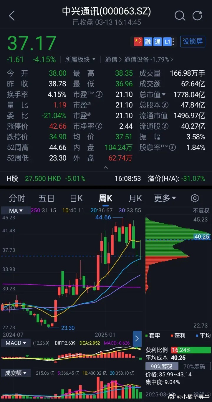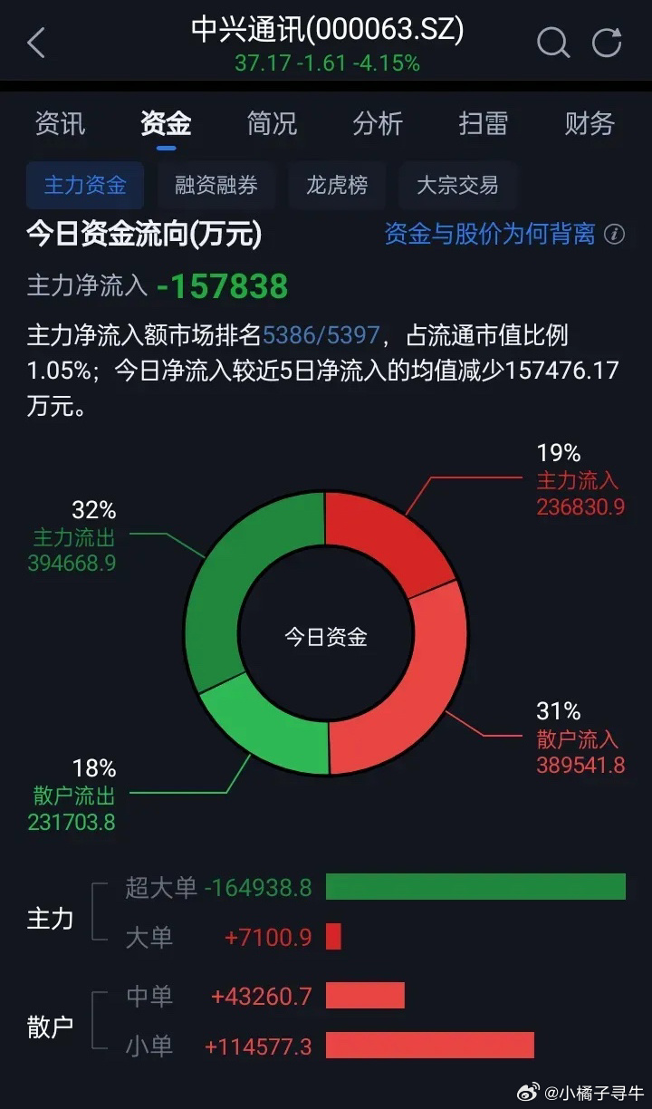 中兴通讯收于37.17元、跌4.15%、成交62.64亿、主力流出15.8亿元。今天这个跳空开盘、单边下行走势,说明昨天的小富即安,保住相对利润的小散策略没问题。昨天进来主力11个亿,今天走了15个亿,每每到100亿的放量大阳,后面接着来个出货诱高再埋。上下筹码峰都重,依旧是上不去下不来。昨天的涨幅,几乎全覆盖了,利好出尽了。明个要还是长跌或开盘急跌,考虑买进,接着玩。主力,融资盘,加油干。