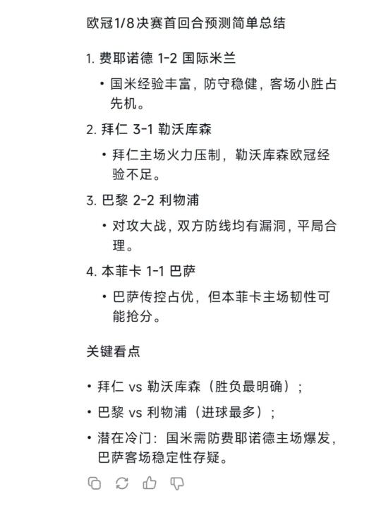 [看R]在昨日的预测中,DeepSeek预测中了皇马2-1马竞,阿森纳和维拉的比赛预测中了胜负,错了比分,只有多特与里尔的比赛是完全错误 DeepSeek预测明天3月6日凌晨欧冠比分: 01:45 费耶诺德1-2国际米兰 04:00 拜仁慕尼黑3-1勒沃库森 04:00 巴黎圣日耳曼2-2利物浦 04:00 本菲卡1-1巴塞罗那 欧冠 英超 西甲 法甲 巴黎圣日尔曼 利物浦 巴萨 拜仁 德甲 聊球俱乐部