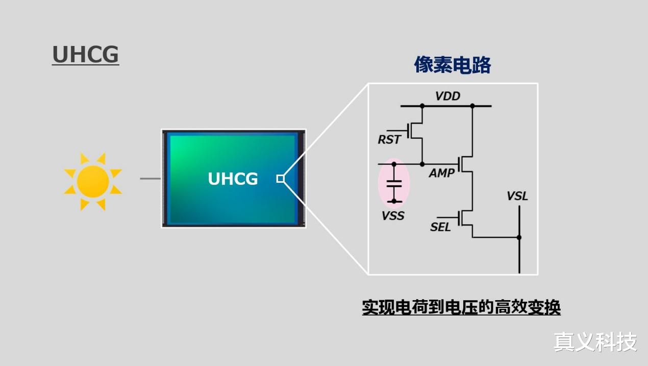 还有就是UHCG功能,其如下图所示在以往的DCG电路基础上,又增加了一个粉圈所示的超小电容,实现了超高转换增益从而大幅减少了暗光拍摄的噪点,并提高了传感器的色阶表现力。