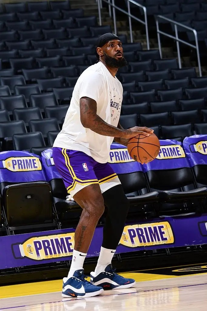 今日赛前热身时詹姆斯上脚了一双蓝白色的Nike LeBron22 "Duques