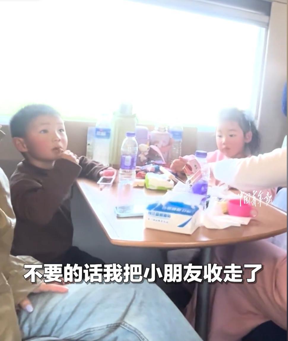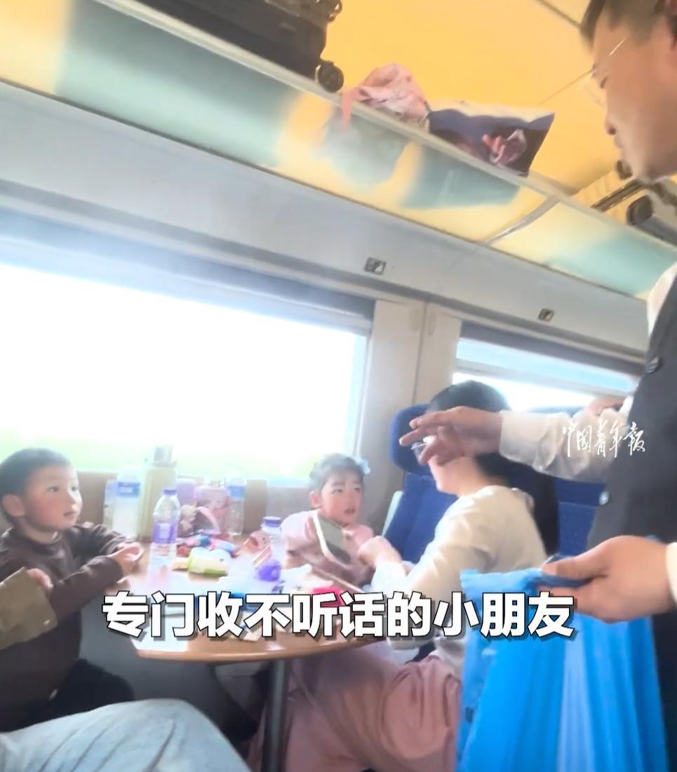 “新版大灰狼来了!”河南,一辆火车上两个小朋友一直大声吵闹,孩子的妈妈找到列车员配合演场戏,最后小朋友的表情亮了!网友:其实我们讨厌的不是小孩子,是放任不管的父母! 相信经常坐火车出行的网友,看到火车上有小孩子的时候,一定会眉头紧皱,因为小孩子不仅十分吵闹,有的时候还四处跑动,最可恨的是好多家长放任不管,弄的乘客们是苦不堪言,然而近日在一列火车上,乘务员和家长教科书似的管教方式,却赢得了乘客们的赞赏。 根据中国青年报3月25日的报道,视频里显示一位乘务员拿着大型号的垃圾袋在车厢里面收垃圾,只见乘客们纷纷把手中的饮料瓶和垃圾放入了垃圾袋中,就在大家都以为这只是一次普通的清洁时,接下来乘务员的一幕让大家看的笑了起来。 而这一幕全程被其他的乘客录了下来,原来两位宝妈想着天气回暖了,想要带着宝宝出去旅游玩一下,为了宝宝的安全考虑,他们选择了坐火车出行。 但是在坐火车时,两位宝宝或许是出于有玩伴,整个过程都十分的吵闹,还时不时的大喊大叫,吵的乘客也不能休息。 两位宝妈尽管一直叫孩子们小点声,但是苦于孩子们已经放飞自我,根本管不住,后来一合计,她们找到了列车的乘务员平先生让他配合演场戏。 他们对平先生说:“孩子实在是太吵了,根本管不了,让车上的乘客都没法好好休息,你能不能借着收垃圾的名义,一会过去就说把不听话的孩子收走。” 平先生看到宝妈这么善解人意,瞬间就答应了她的请求,于是过了没一会,他就拿着大袋子走进了车厢,开始喊道:“收垃圾了,有不用的垃圾都扔一下。” 走着走着,就来到了两个小朋友的位置,此时这两个小朋友还没意识到将要发生什么,还在那里边玩边吃着东西,这时平先生说了一句:“小朋友要不要了,不要的话我把小朋友也收走了。” 听了这话的两个小朋友当时脸色就变了,一脸恐惧的看着平先生,不明白为什么要把自己收走,平先生接着说道:“专门收不听话的小朋友和爱玩手机的。” 听了这话,小女孩瞬间就把手里的手机给了妈妈,小男孩的妈妈则是说道:“不要了不要了,快点带走吧。” 平先生还问男孩的妈妈是这个带走吧?男孩的妈妈说道:“不是,把两个都带走,不要了。” 听见这话,两个孩子连连摇头,平先生看到他们害怕了,紧接着对孩子说道:“听话好好吃饭,好好睡觉就不收你啊,要是不听话,等会就把你们装到垃圾袋里带走了。” 临走之前还问了一句:“要不要带走一个?”没等宝妈们回话,小男孩一直摇头。 到临走的时候,平先生看到两个小朋友确实被吓到了,还安慰他们不要紧张,接下来的时间两个小朋友则是十分安静的坐在那,一直听妈妈的话。 此事一经发出,网友们都笑坏了,有人说:当小孩也是成长路上到处是险恶啊,太害怕了。 还有网友说:学会了,下次再坐车孩子不听话了,我就问收垃圾的乘务员,收不收不听话的小孩? 这件事虽然只是一件小事,但是乘务员的睿智和妈妈的配合,成功的让孩子安静了下来,给了其他乘客休息的时间,不得不说要为这样的宝妈点赞。 信息来源:@中国青年报·2025.03.25孩子吵闹家长管不住,列车售货员:这题我会!