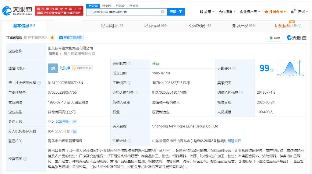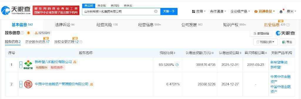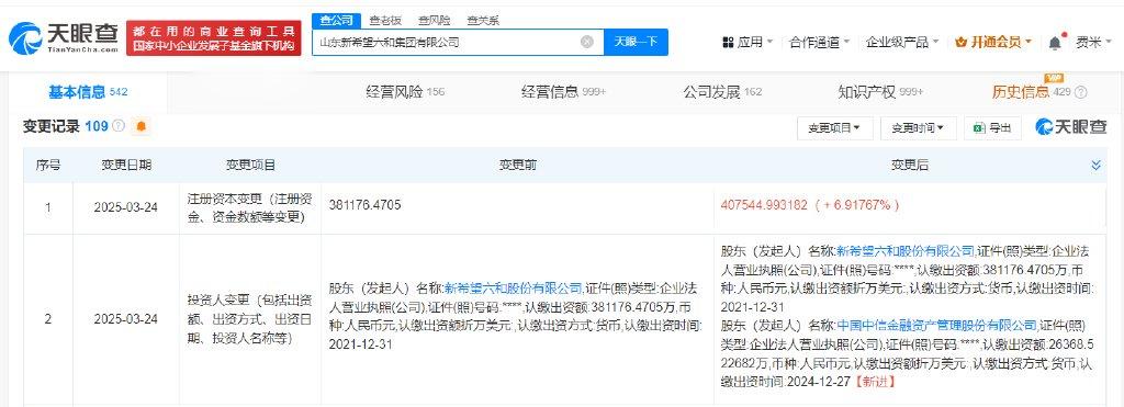 天眼查App显示,近日,山东新希望六和集团有限公司发生工商变更,新增中信金融资产(HK.02799)为股东,同时注册资本由约38.1亿人民币增至约40.8亿人民币。